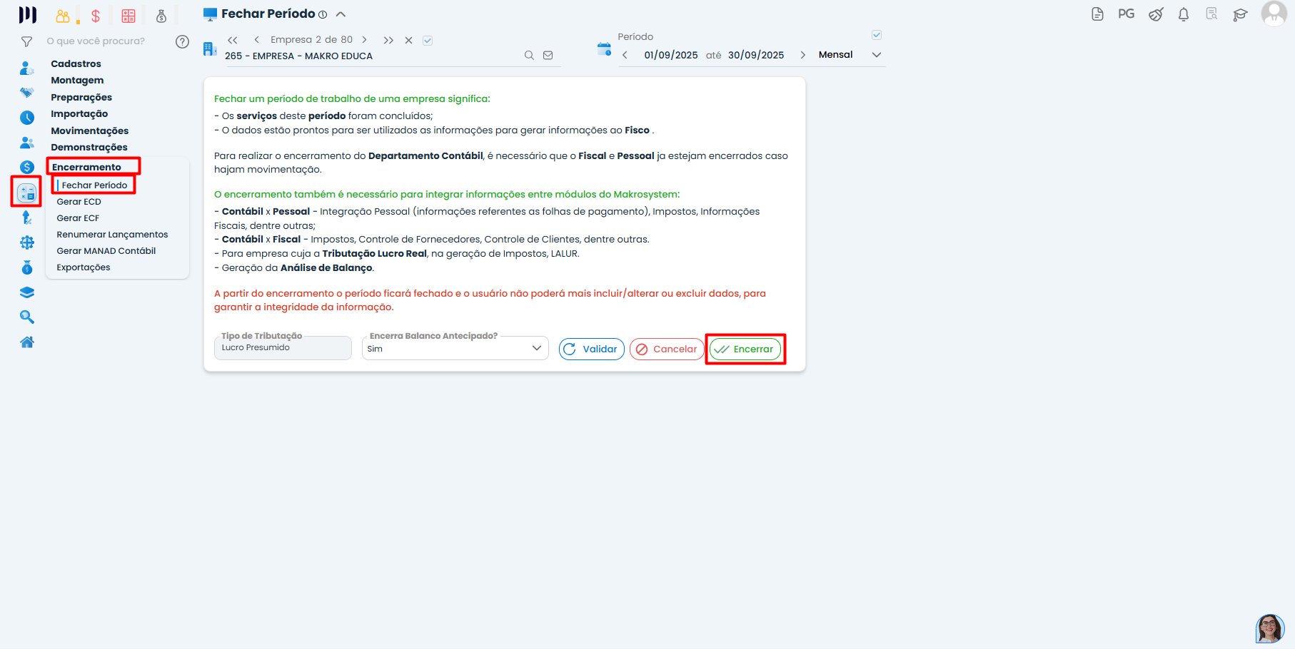 Após o cadastro deve-se realizar o encerramento do departamento Contábil indo em Contábil > Encerramento > Fechar Período.