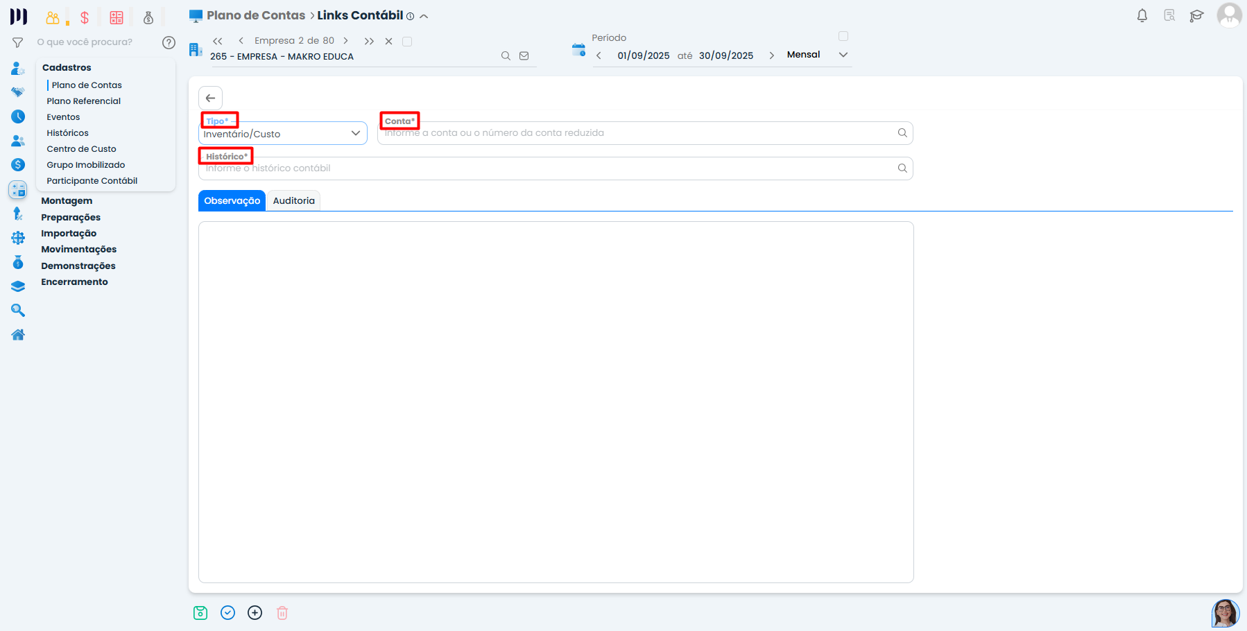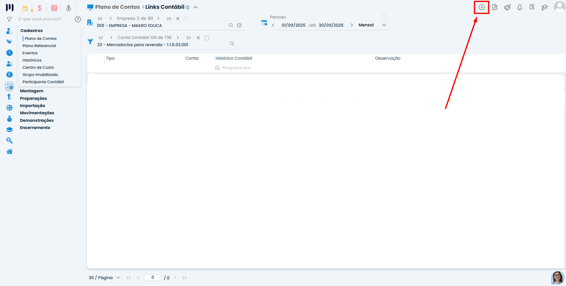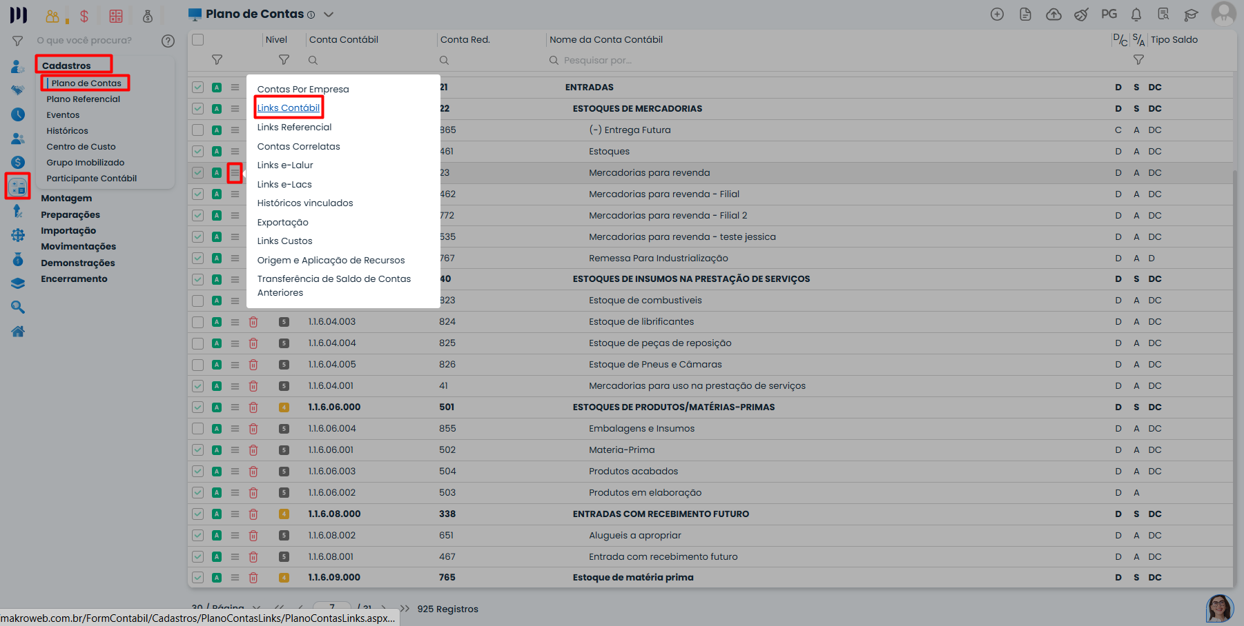 No sistema, navegue até Contábil > Cadastros > Plano de contas > Busque a conta utilizada para estoque e no sub menu acesse a Links Contábil.