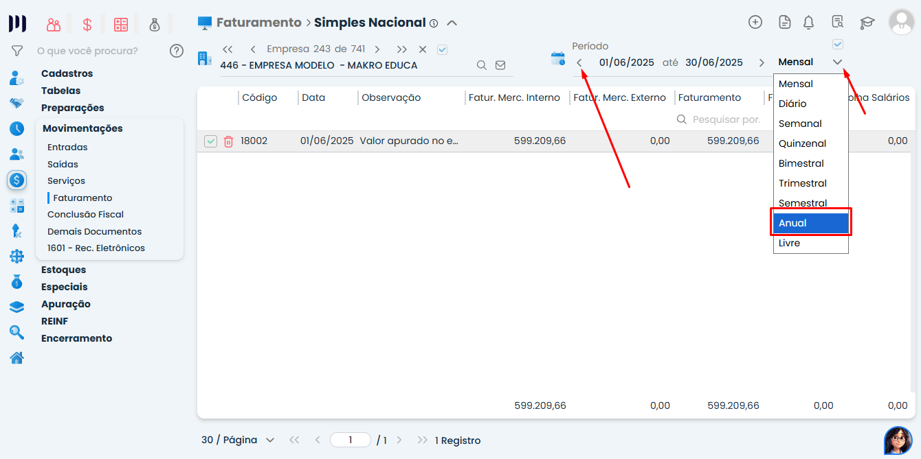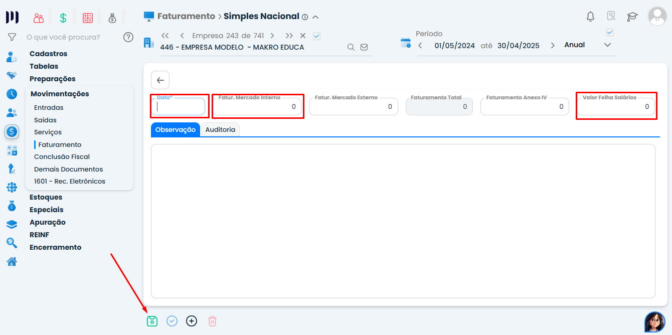 Acesse o módulo: Fiscal > Movimentações > Faturamento > Acessar Faturamento para o Simples Nacional (Bolsinha de dinheiro )