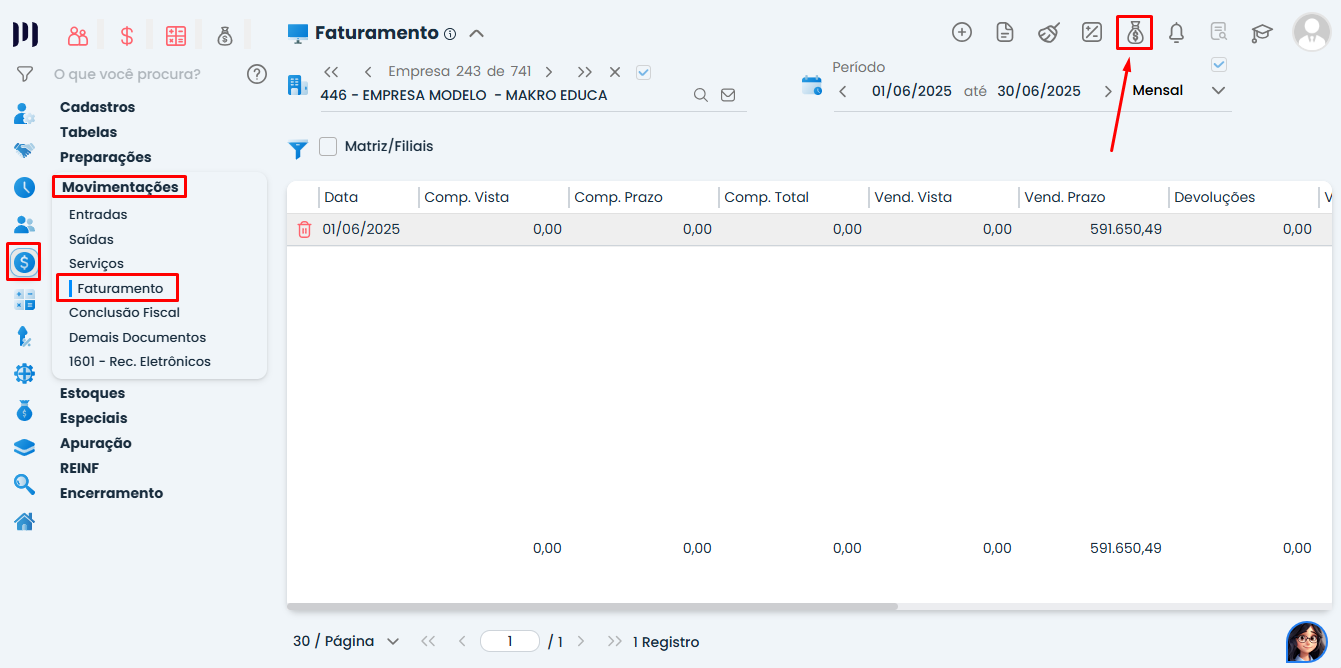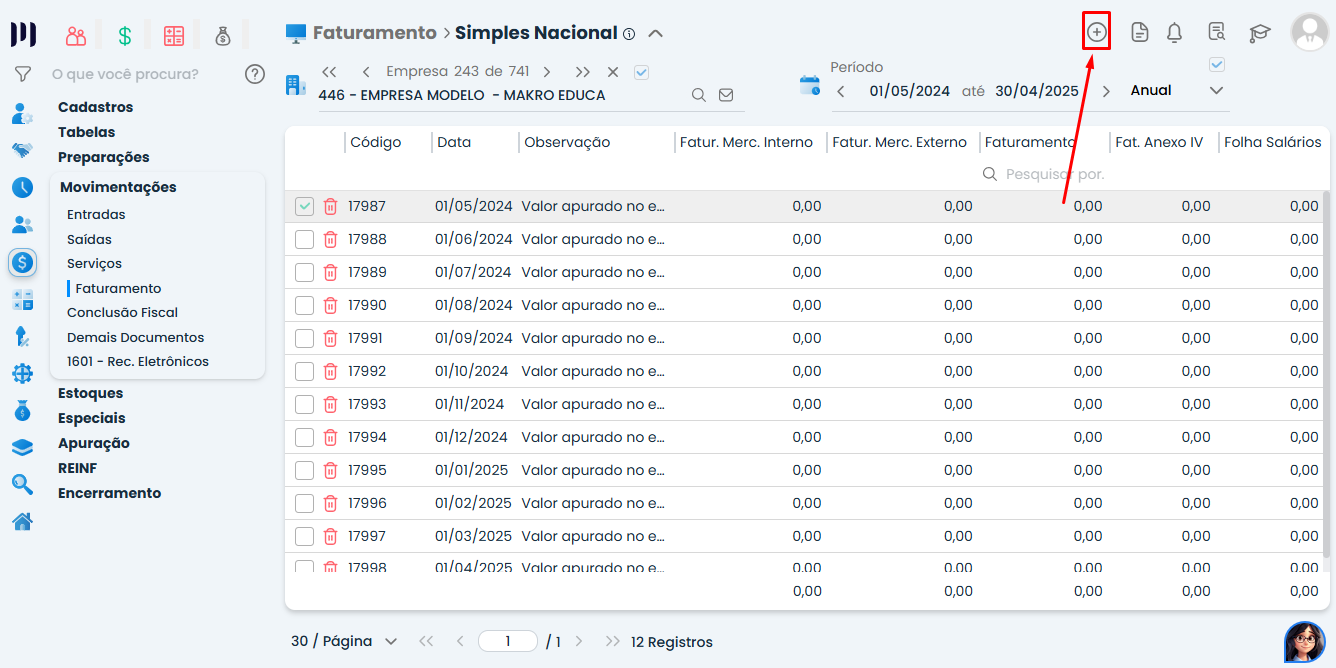 Modulo Fiscal > Movimentações > Faturamento > Acessar Faturamento para o Simples Nacional (Bolsinha de dinheiro