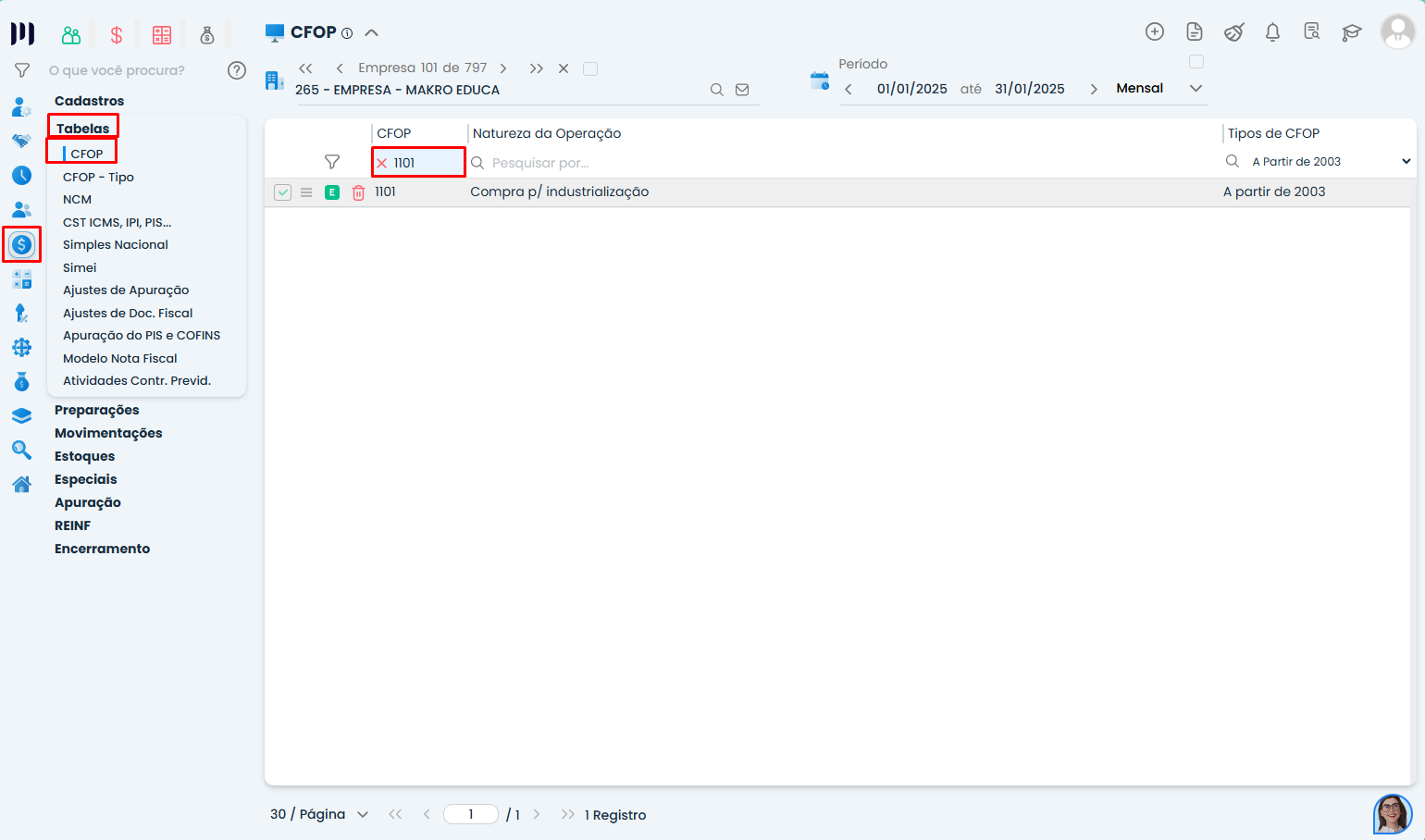 No cadastro do CFOP, clique no ícone de três pontos (⋮) ao lado do item.