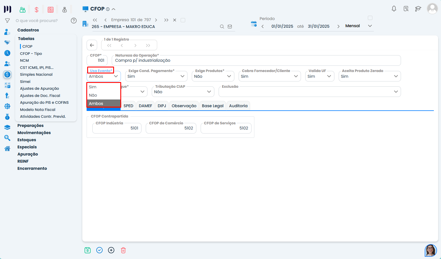 Se uma nota não estiver sendo contabilizada, verifique primeiro o campo “Usa evento” no CFOP.