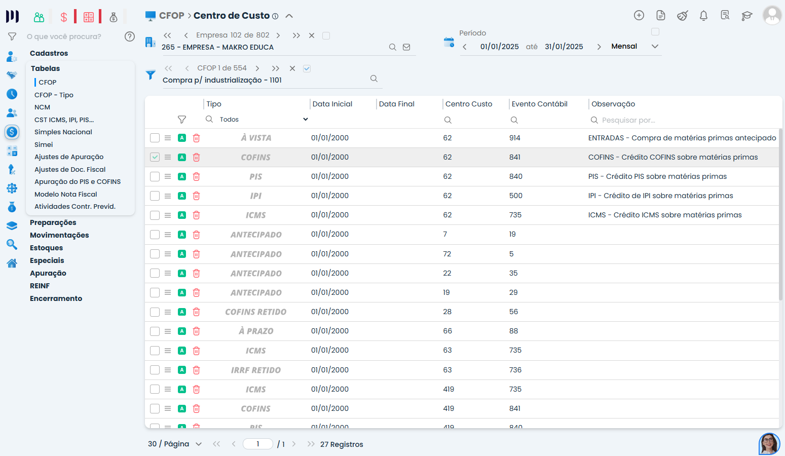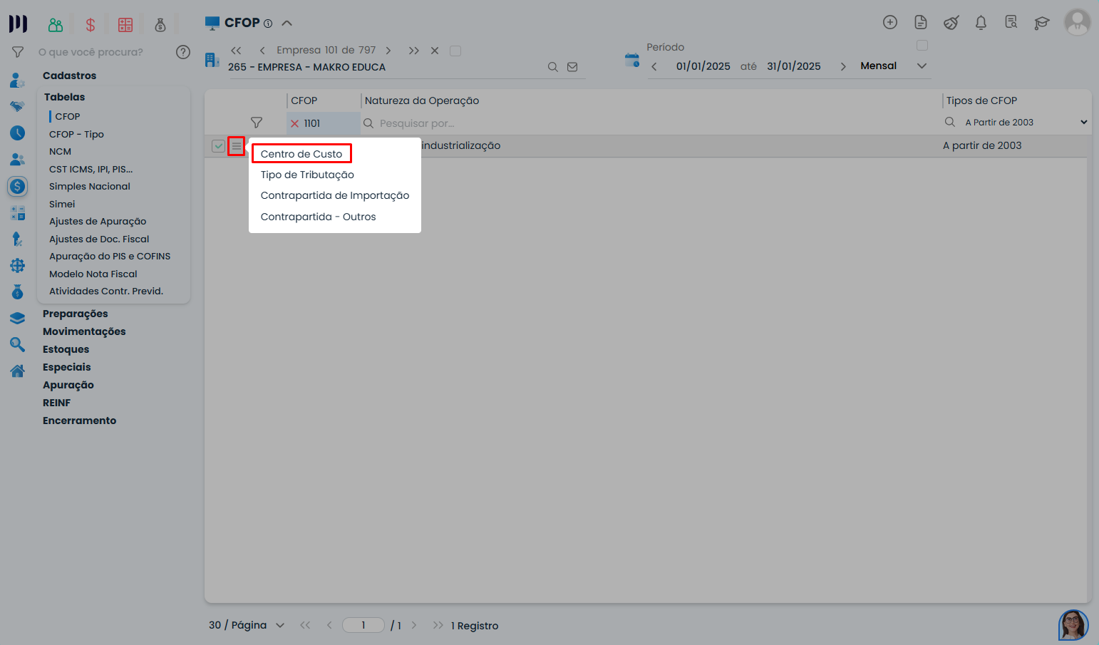 Para CFOPs marcados como “Ambos”, o centro de custo deve ser informado manualmente na nota.