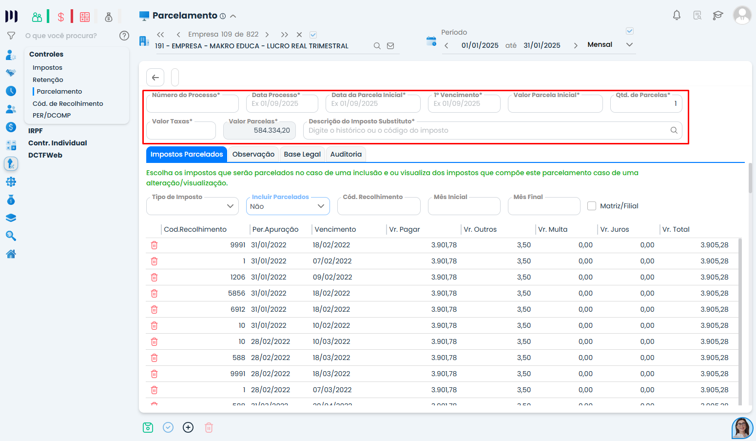 Para parcelamentos complexos, consulte primeiro a seção de ajuda