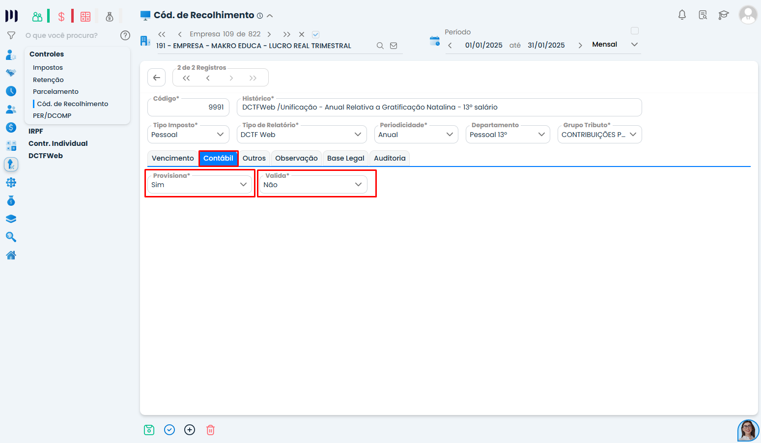 Ter Provisiona e Valida = NÃO (encontre esta opção na aba Contábil no cód. de recolhimento)
