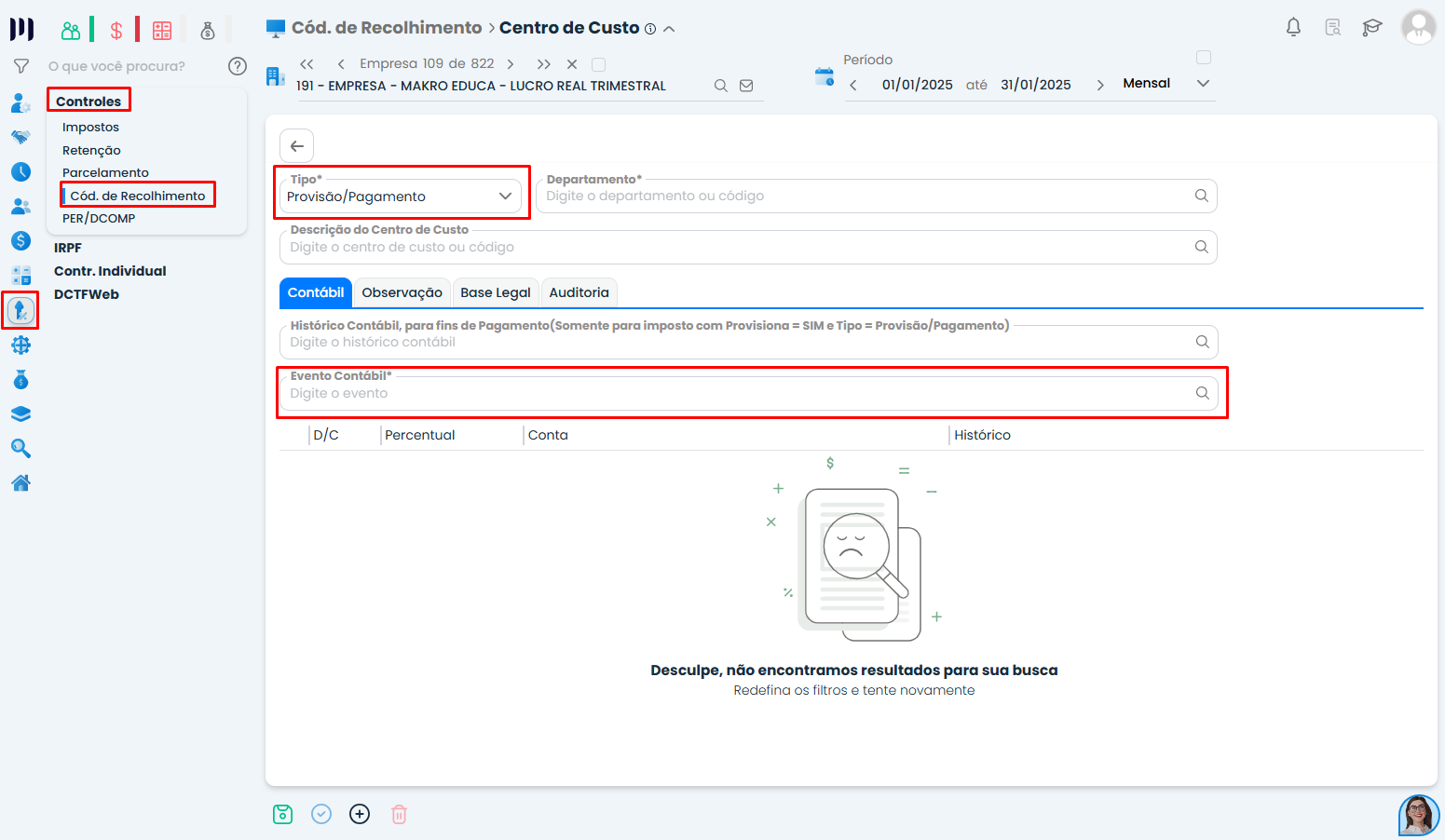 Precisam ter Centro de Custo com evento de PAGAMENTO