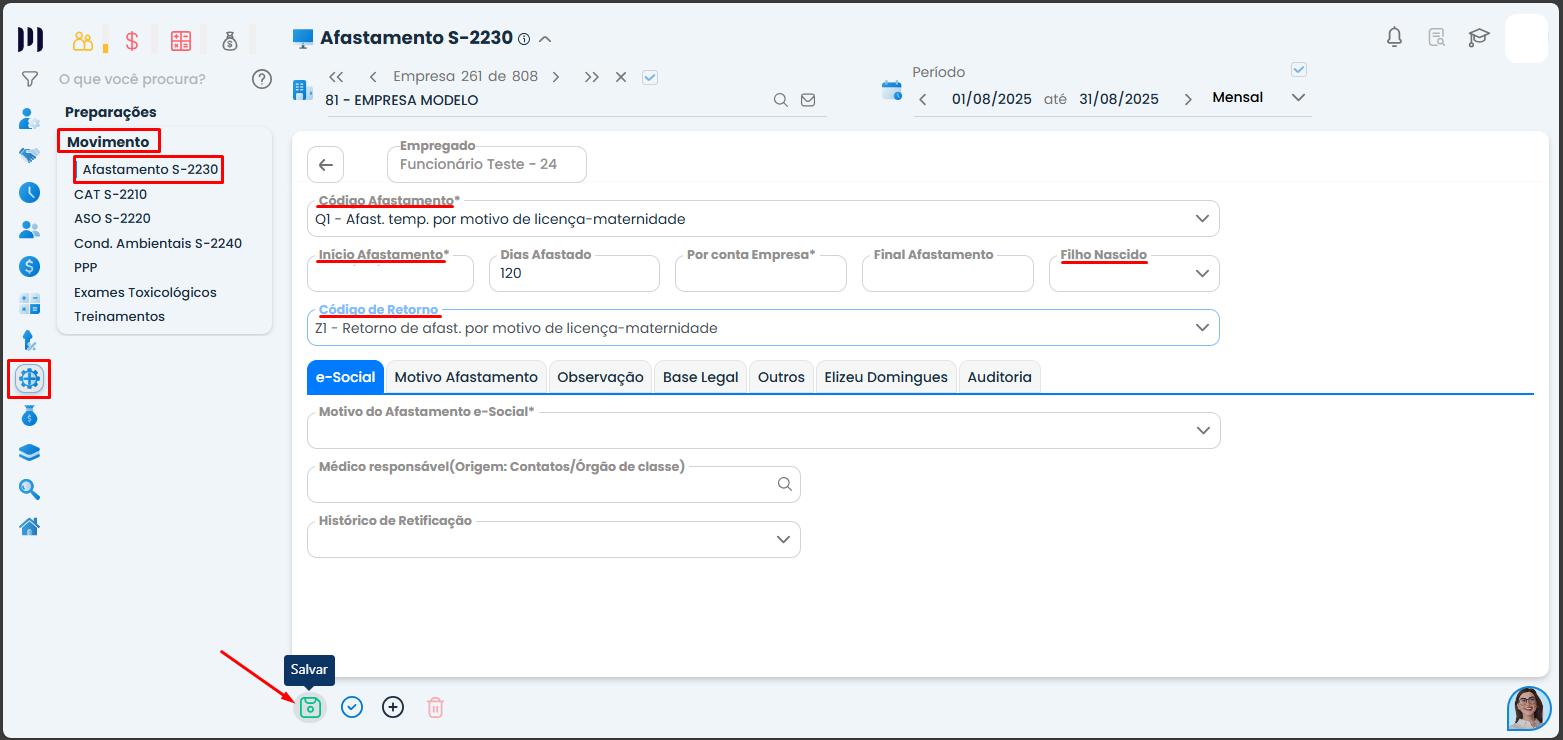 Como cadastrar o afastamento por Maternidade (Licença-Maternidade) no sistema Makrosystem e enviar ao eSocial (S-2230).