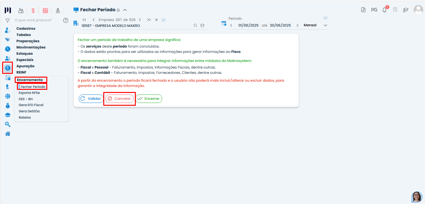Após corrigir a atividade, encerre o período fiscal novamente.