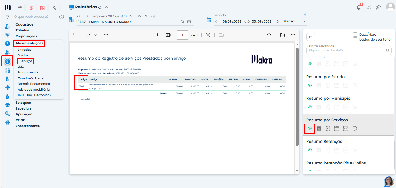 Emita o relatório “Resumo por Serviços” para confirmar qual atividade está vinculada às notas fiscais.