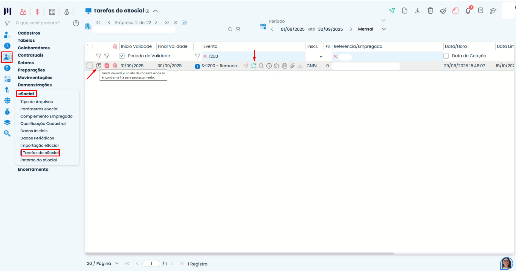 Acesse o menu Pessoal>eSocial>Tarefas do eSocial;
