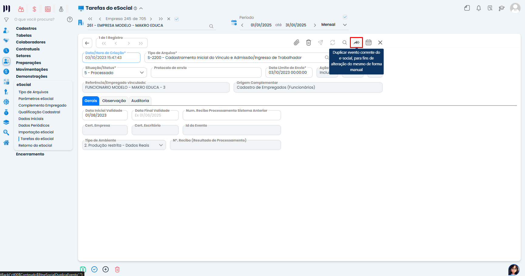 Clique dentro do evento S-2200 ou S-2300 e selecione a opção para duplicá-lo.