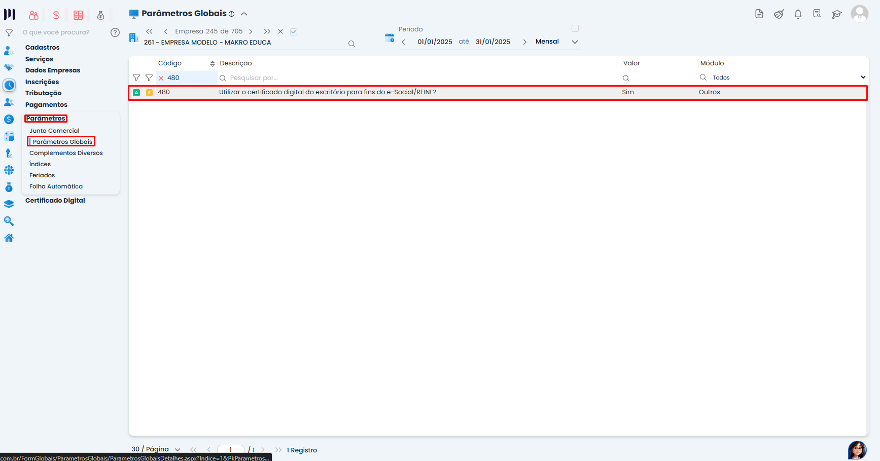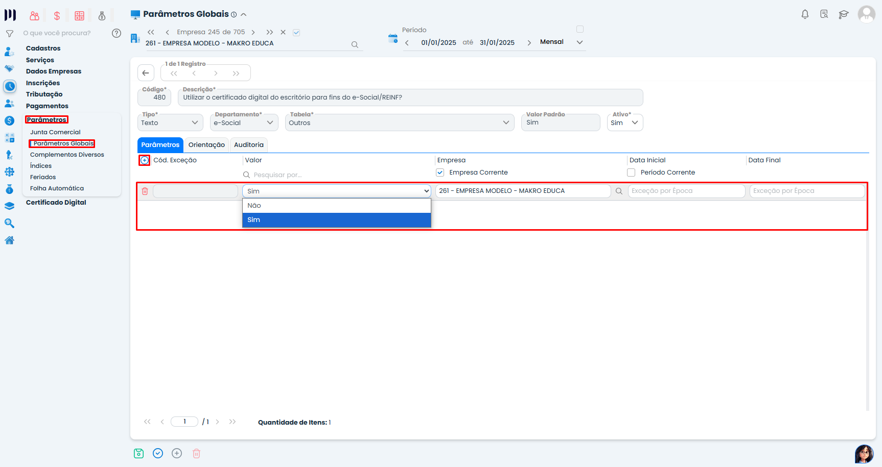 - Caso queira fazer uma exceção somente para aquela empresa, clique dentro do parâmetro 480.