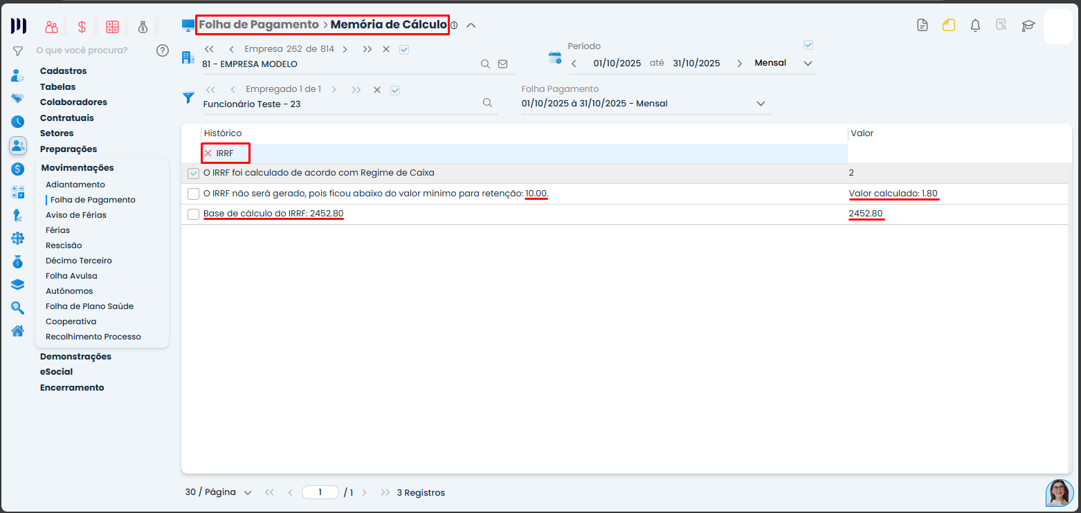 - Verifique também se o valor calculado de IRRF não ficou abaixo de R$10,00, pois valores inferiores a esse limite não são descontados;