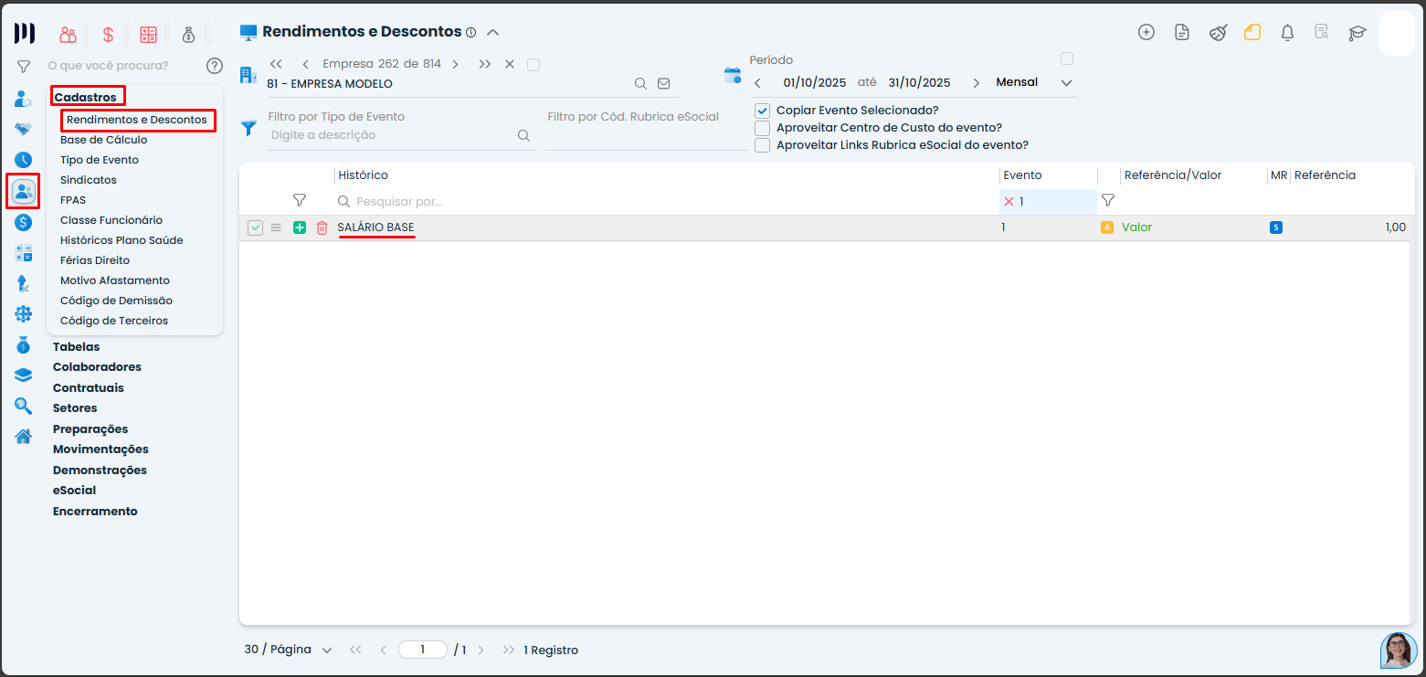 Acesse o menu Pessoal>Cadastros>Rendimentos e Descontos;