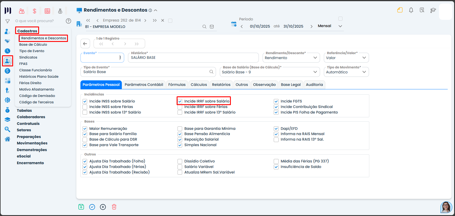 Verifique se, na configuração de cada evento, a opção “Base de IRRF” está corretamente marcada, quando aplicável.