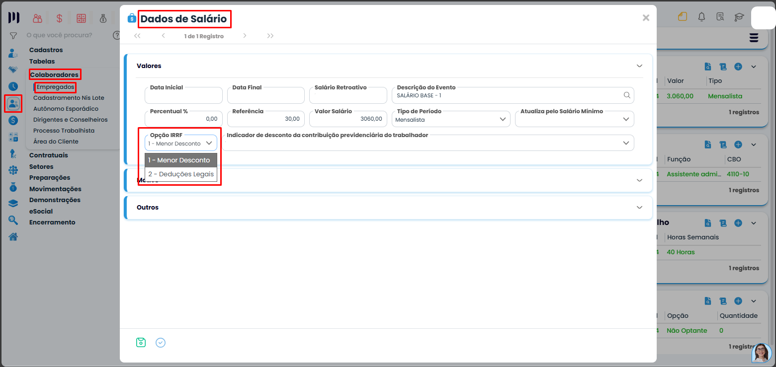 Passo 3: Verifique a opção de IRRF marcada no cadastro de salário do empregado: