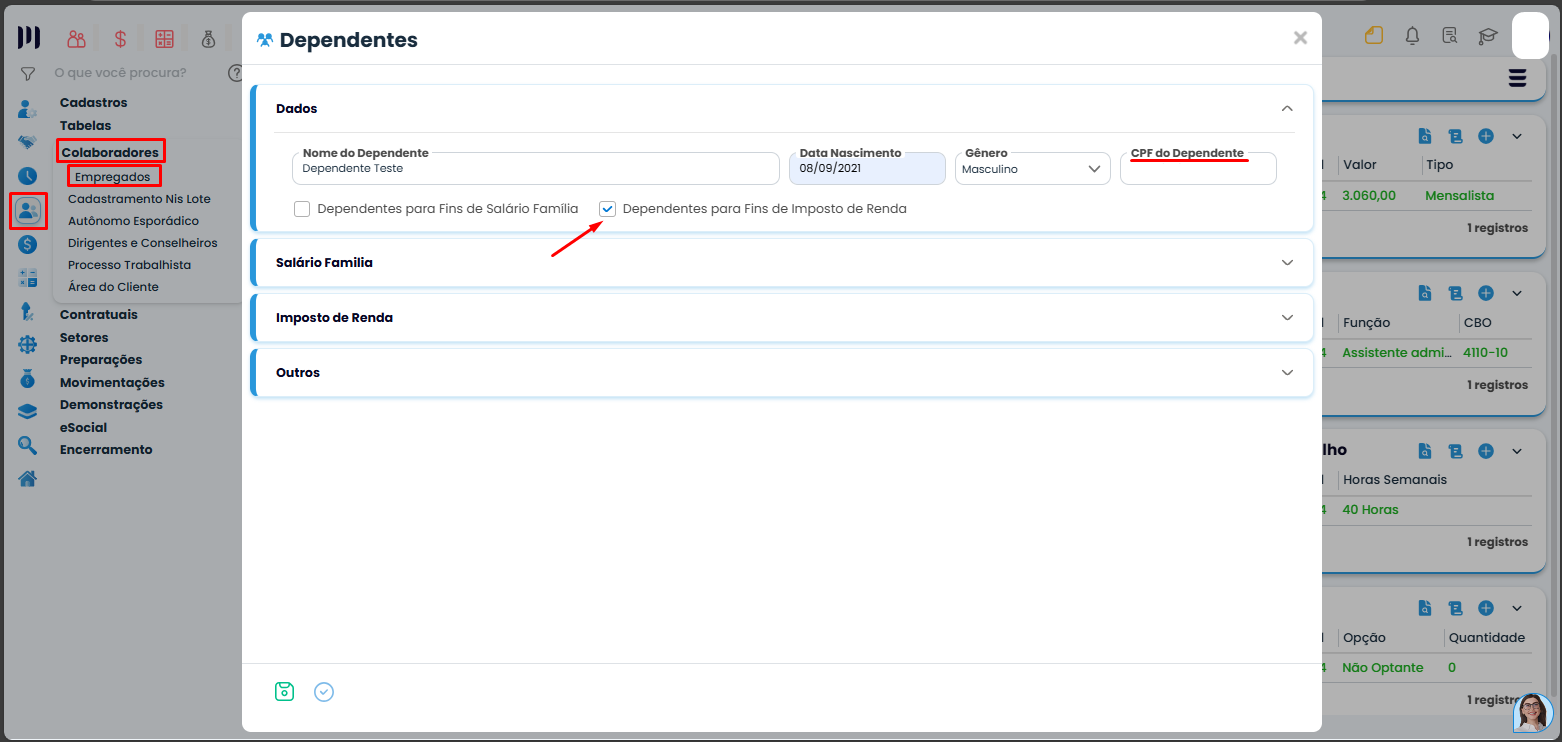 - Verifique se está marcado o campo ‘Dependentes para fins de Imposto de Renda’;