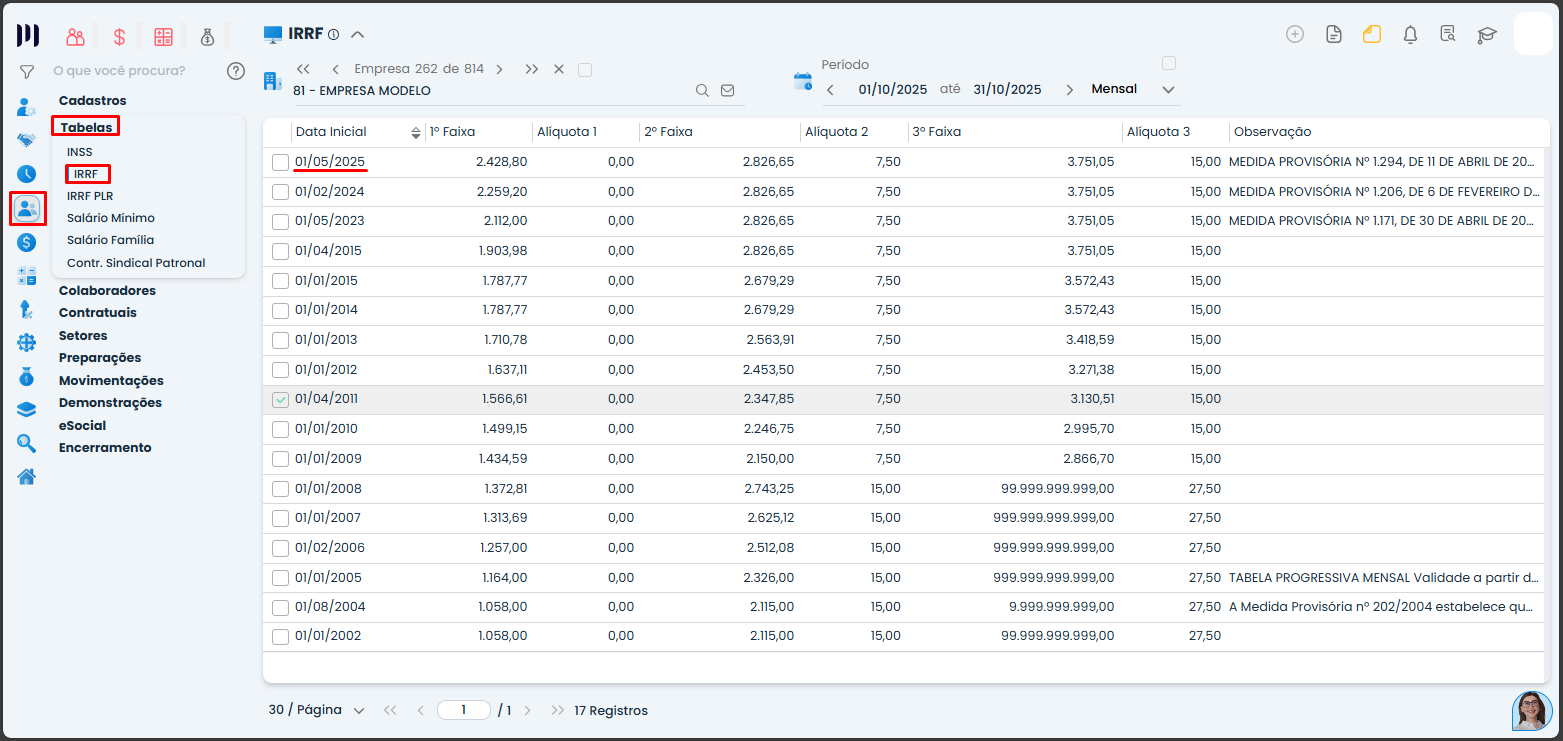 ⚠️ Atenção: Você pode acessar a tabela vigente do IRRF pelo caminho Pessoal>Tabelas>IRRF;
