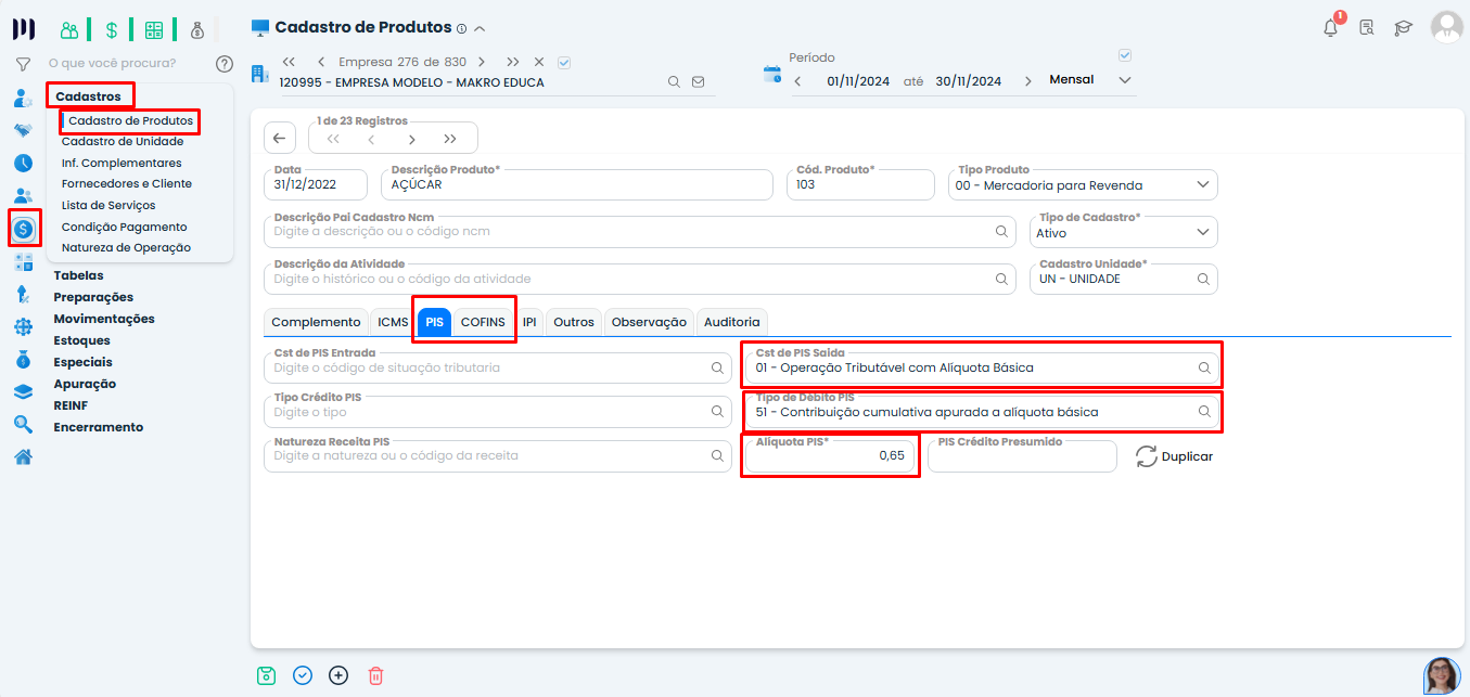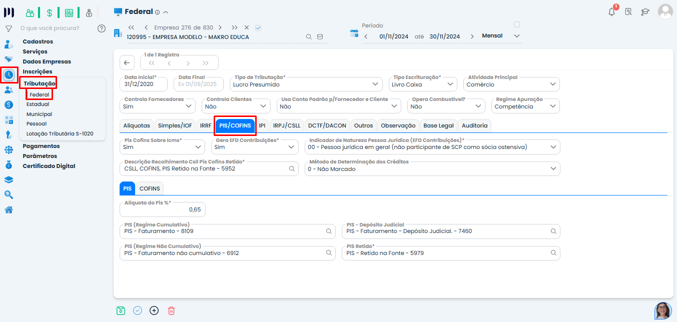 Verifique se as configurações de PIS e COFINS estão alinhadas com a tributação da empresa.