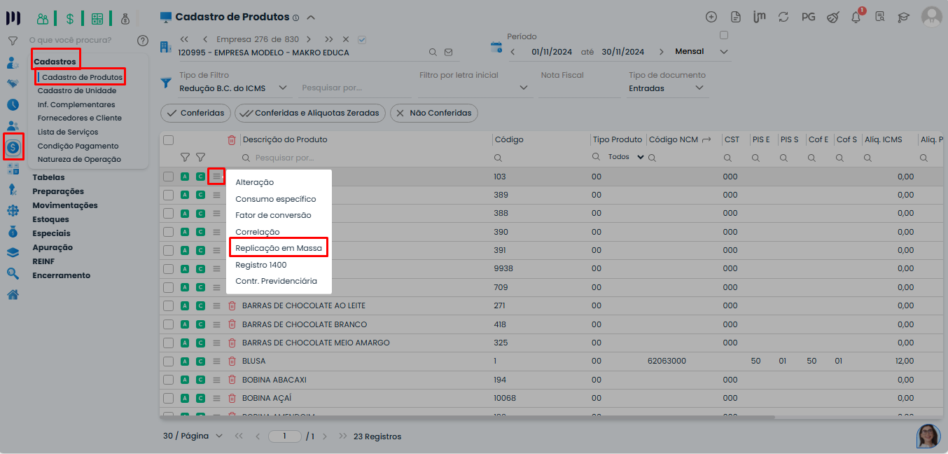 Acesse o cadastro de produtos relacionados às notas fiscais.