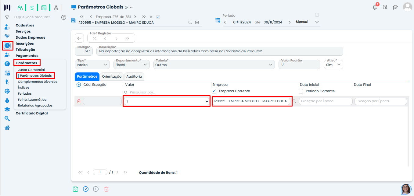 - Dica: Não deixe de verificar o parâmetro global 390 para empresa prestação de serviço e os parâmetros globais 506 e 517 para comércio e indústria.