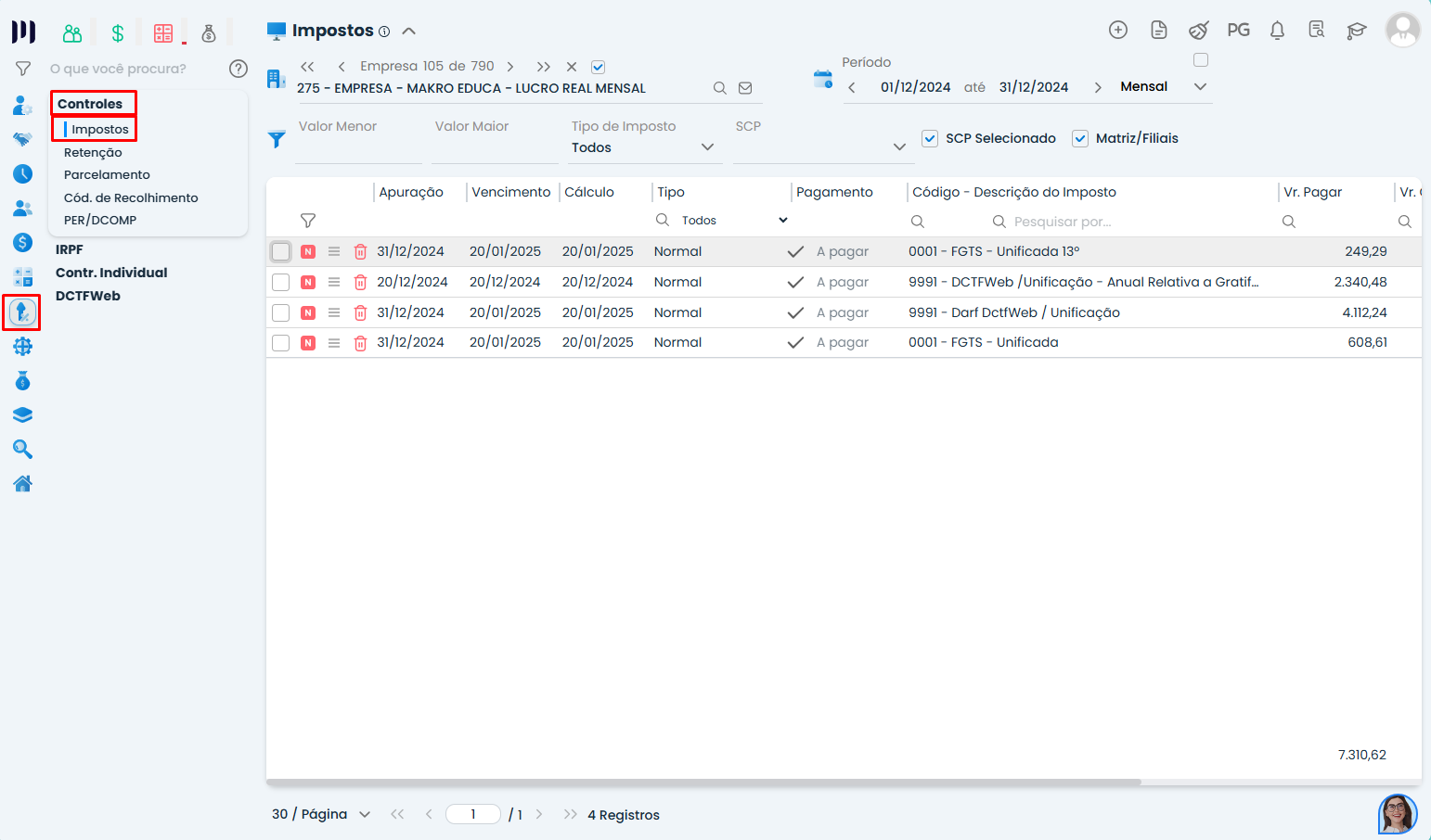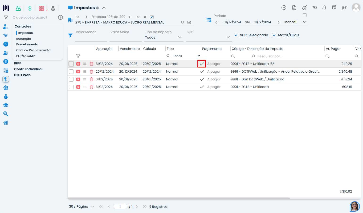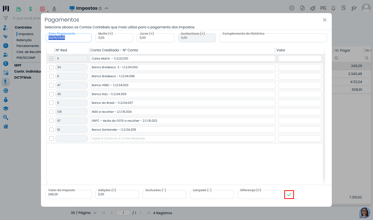 • Resultado esperado: O sistema baixará a guia e gerará automaticamente o lançamento contábil.