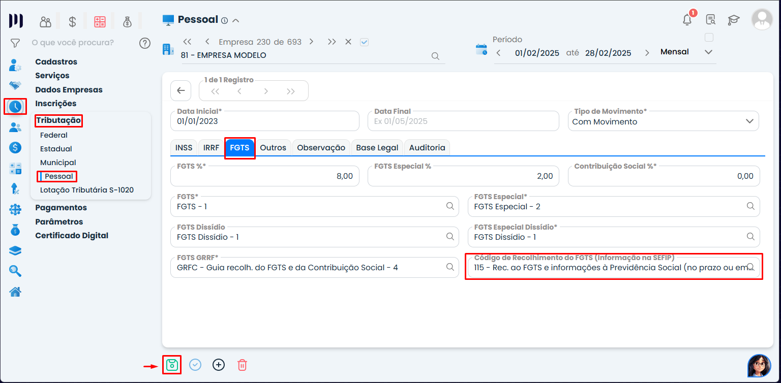 Passo 4: Dentro dessa aba, encontre o campo chamado Código de Recolhimento do FGTS (Informação na SEFIP).