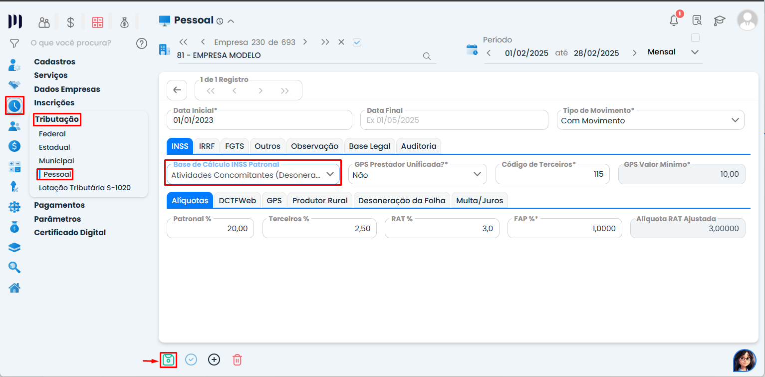 Passo 2: Localize o campo chamado Base de Cálculo INSS Patronal e selecione a opção Atividades concomitantes;