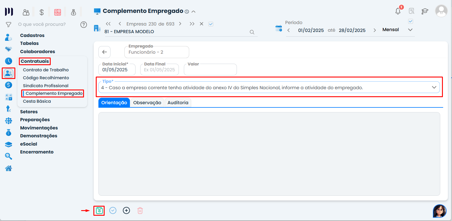 O tipo 4 no complemento indica ao sistema a apuração por anexo, essencial para o cálculo correto do INSS patronal em atividades concomitantes;