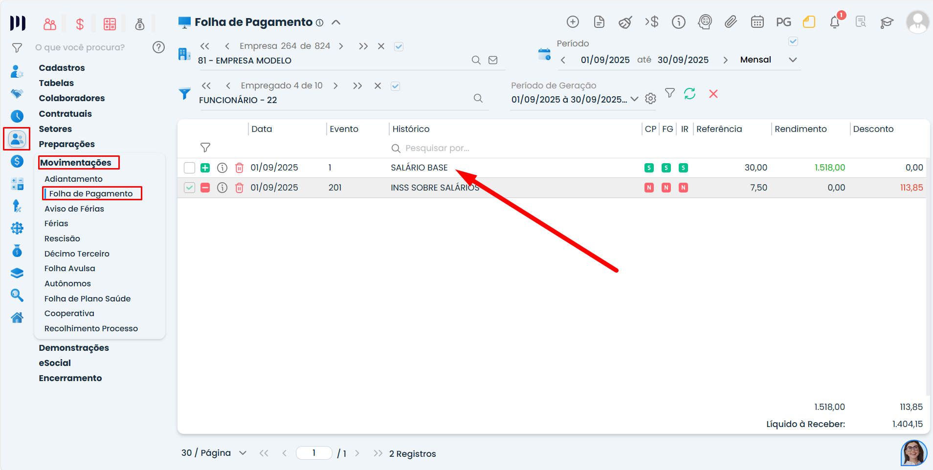 Passo 1: Acesse folha de pagamento gerada do empregado em Pessoal>Movimentações>Folha de pagamento;
