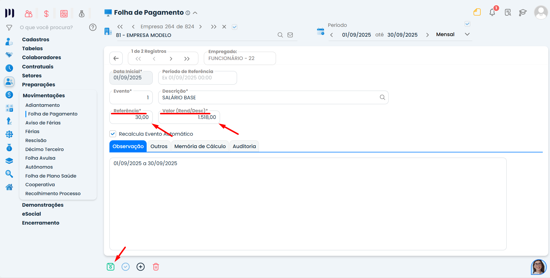 Passo 2: Clique sobre o evento faça o lançamento manual, ajustando os dias trabalhados proporcionalmente ao retorno no dia 31;
