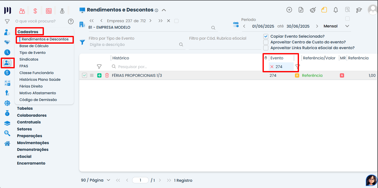 Passo 3: até Pessoal, clique em Cadastros e selecione Rendimentos e Descontos.
