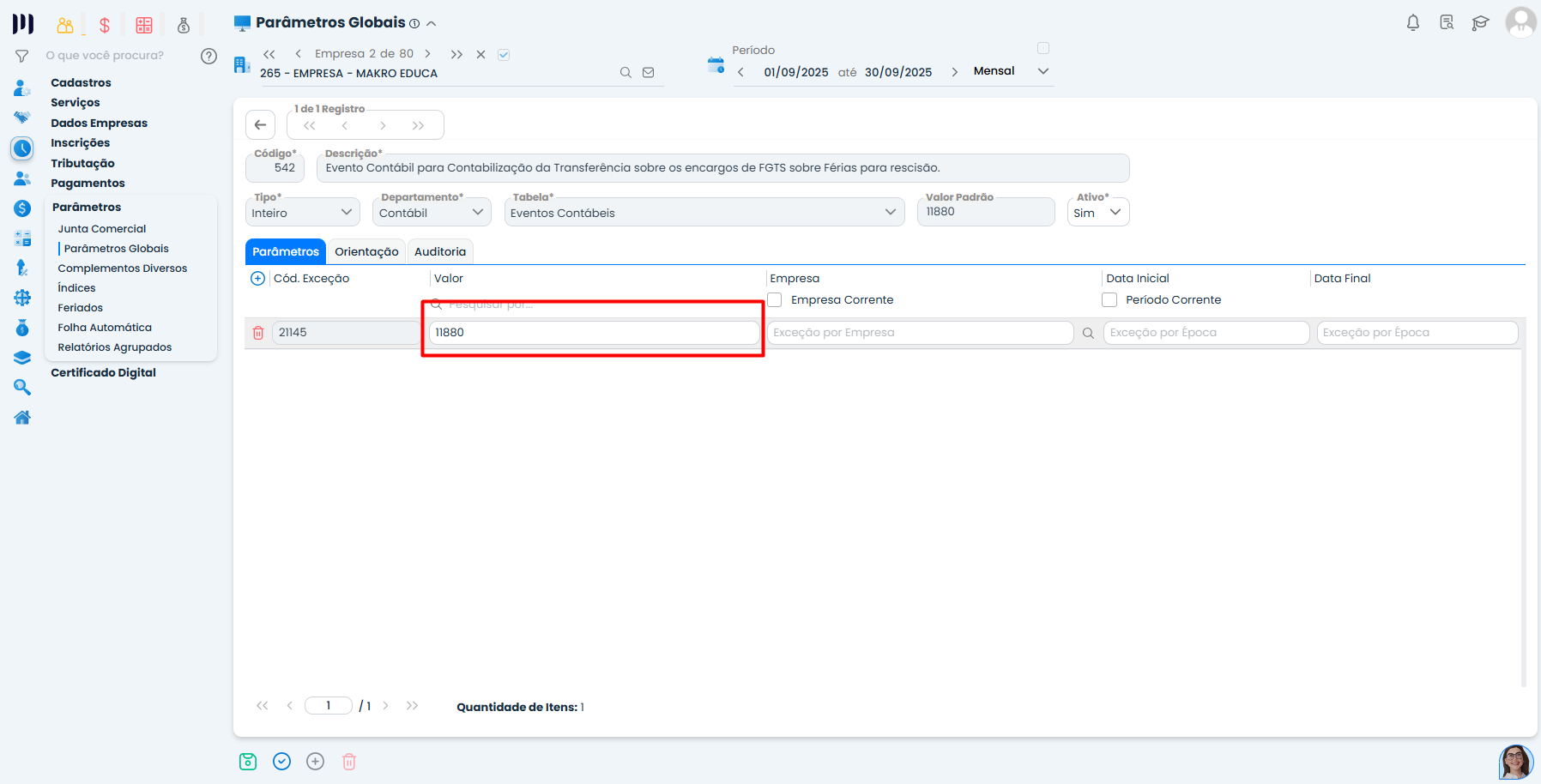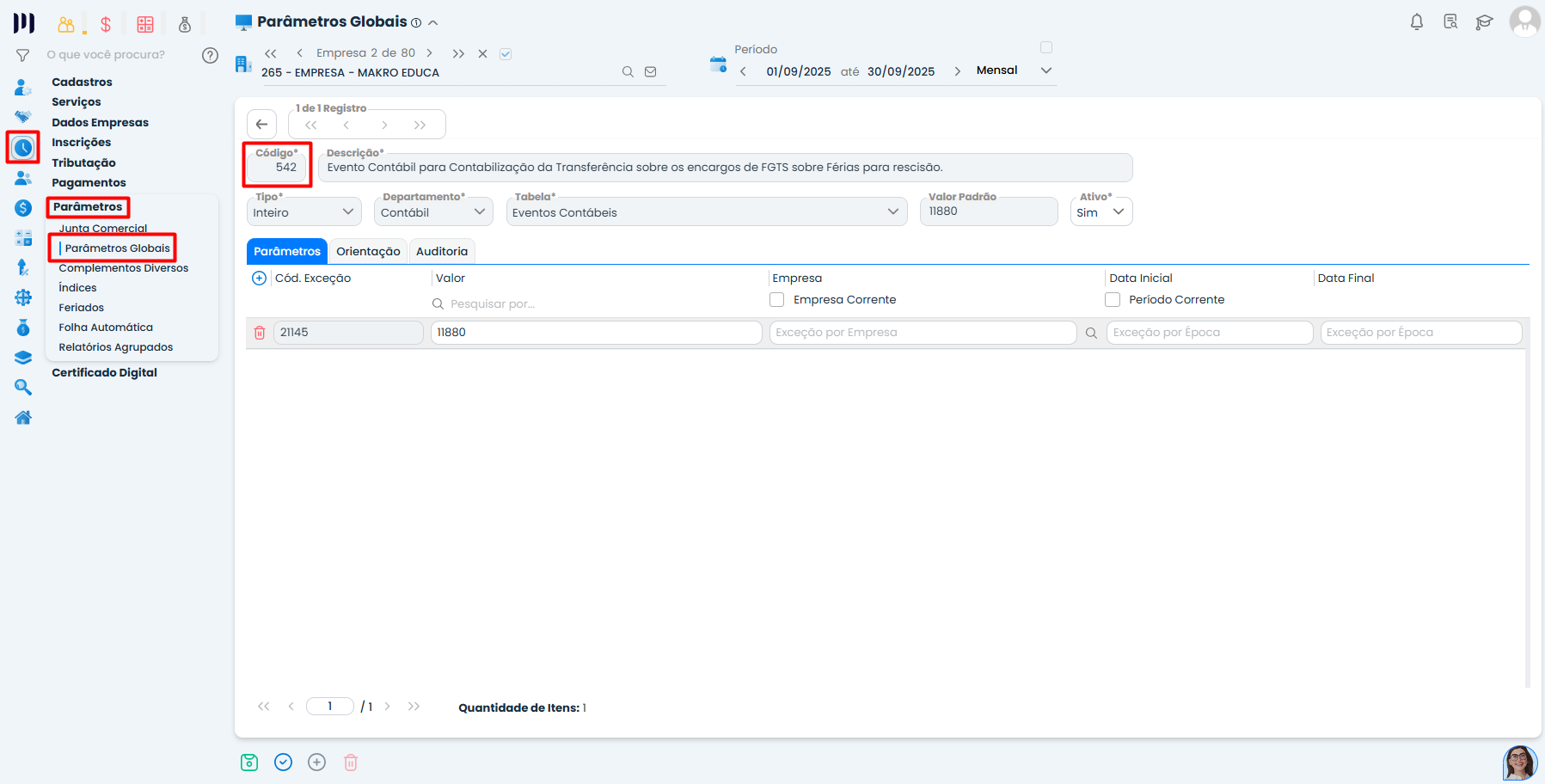 Retorne ao cadastro do parâmetro 542 em Parâmetros Globais.