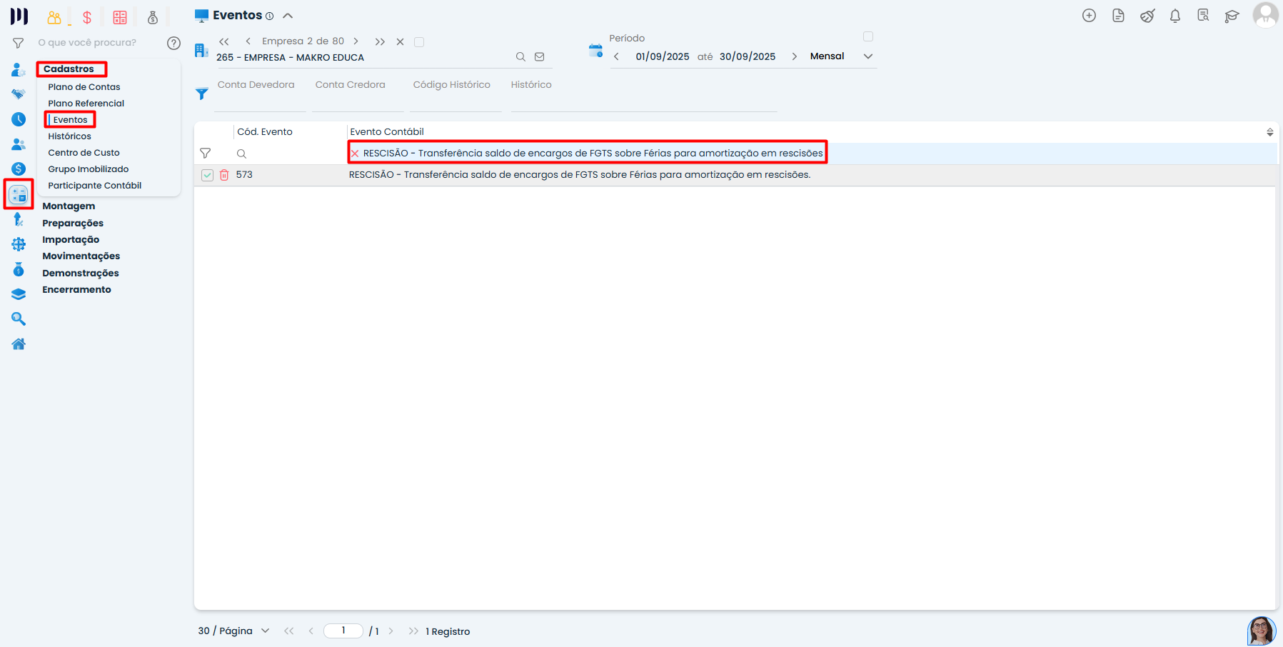 Acesse: Contábil > Cadastros > Eventos.