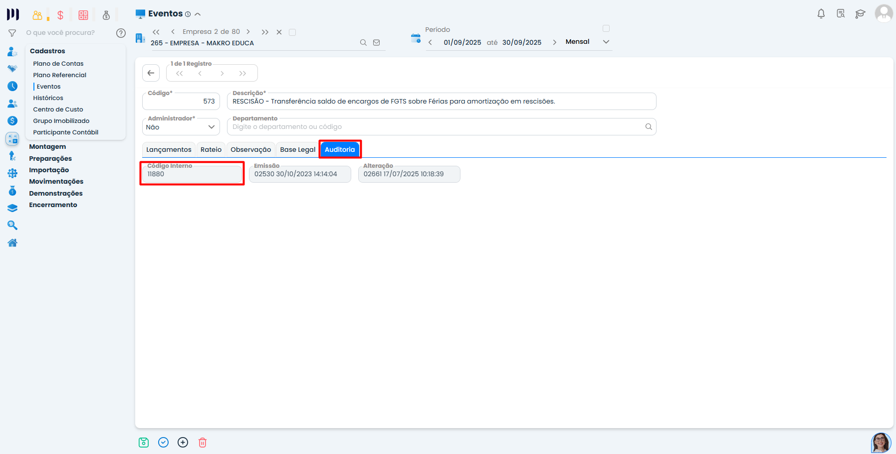 No cadastro do evento, localize a aba Auditoria.