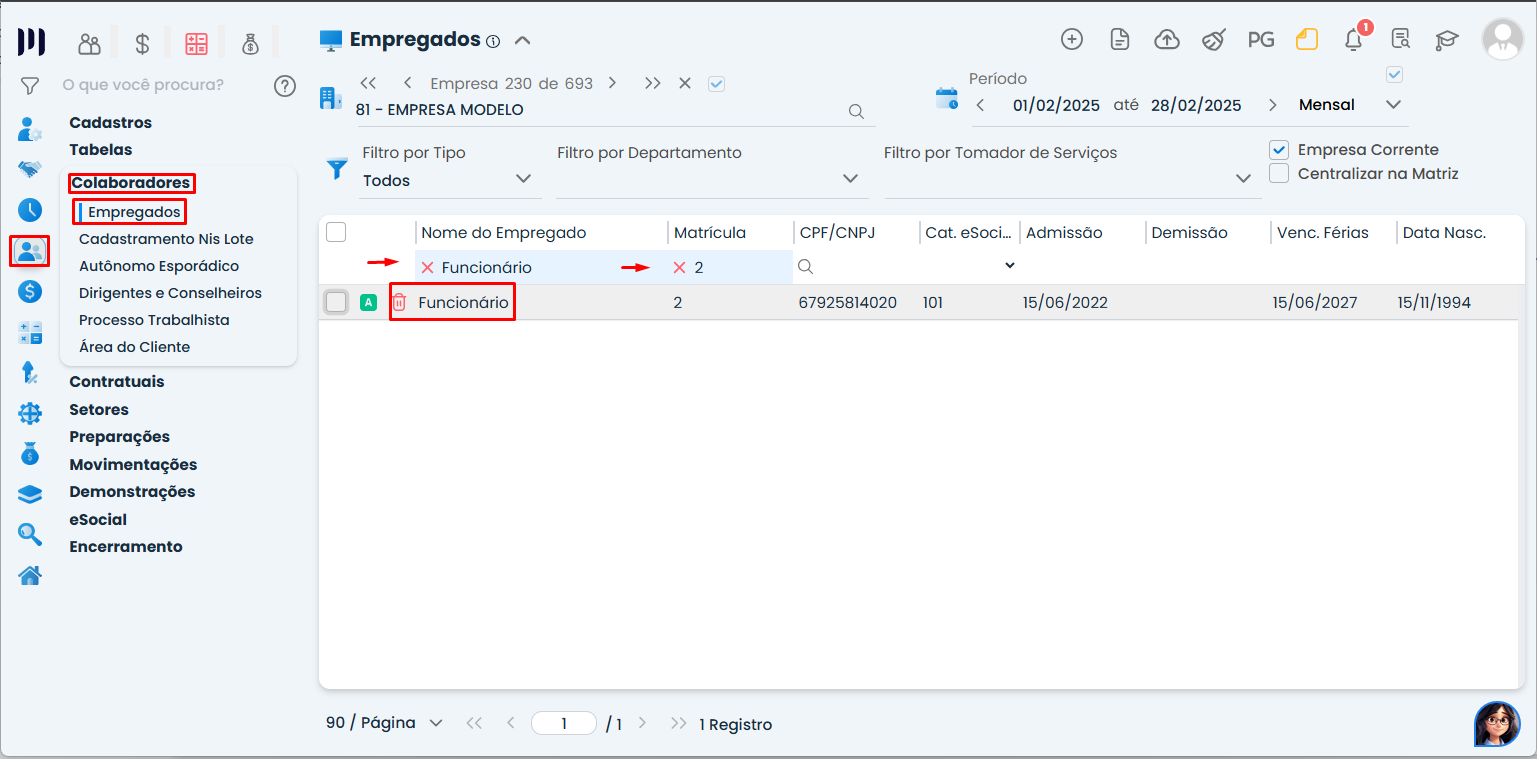 Pesquise pelo nome ou matrícula do colaborador na ferramenta de pesquisa.