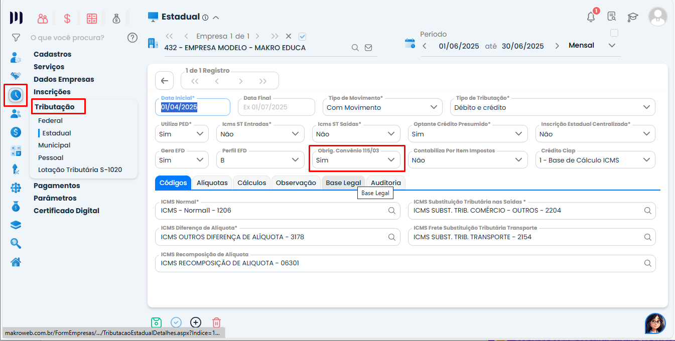 No cadastro da Tributação Estadual > Obrig. Convênio 115/03 deve-se atentar em marcar como “SIM”.