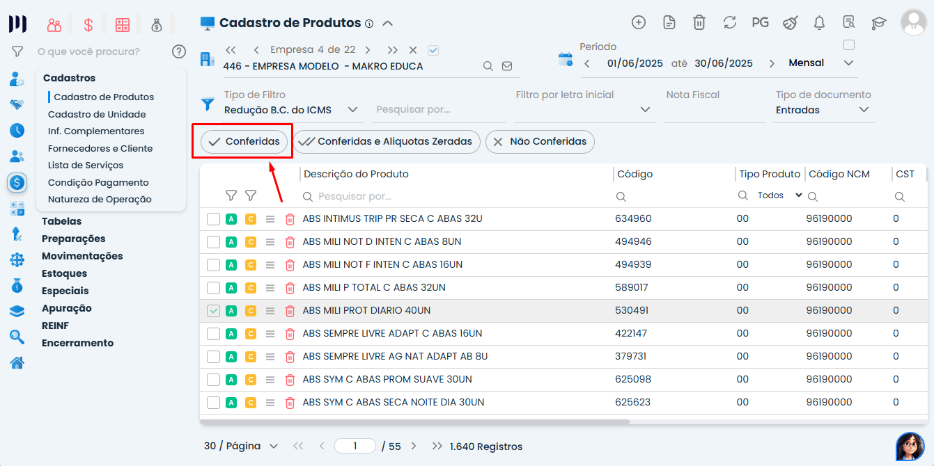 Modulo Fiscal > Cadastros > Cadastro de Produtos > Acessar “Filtro por Conferência”