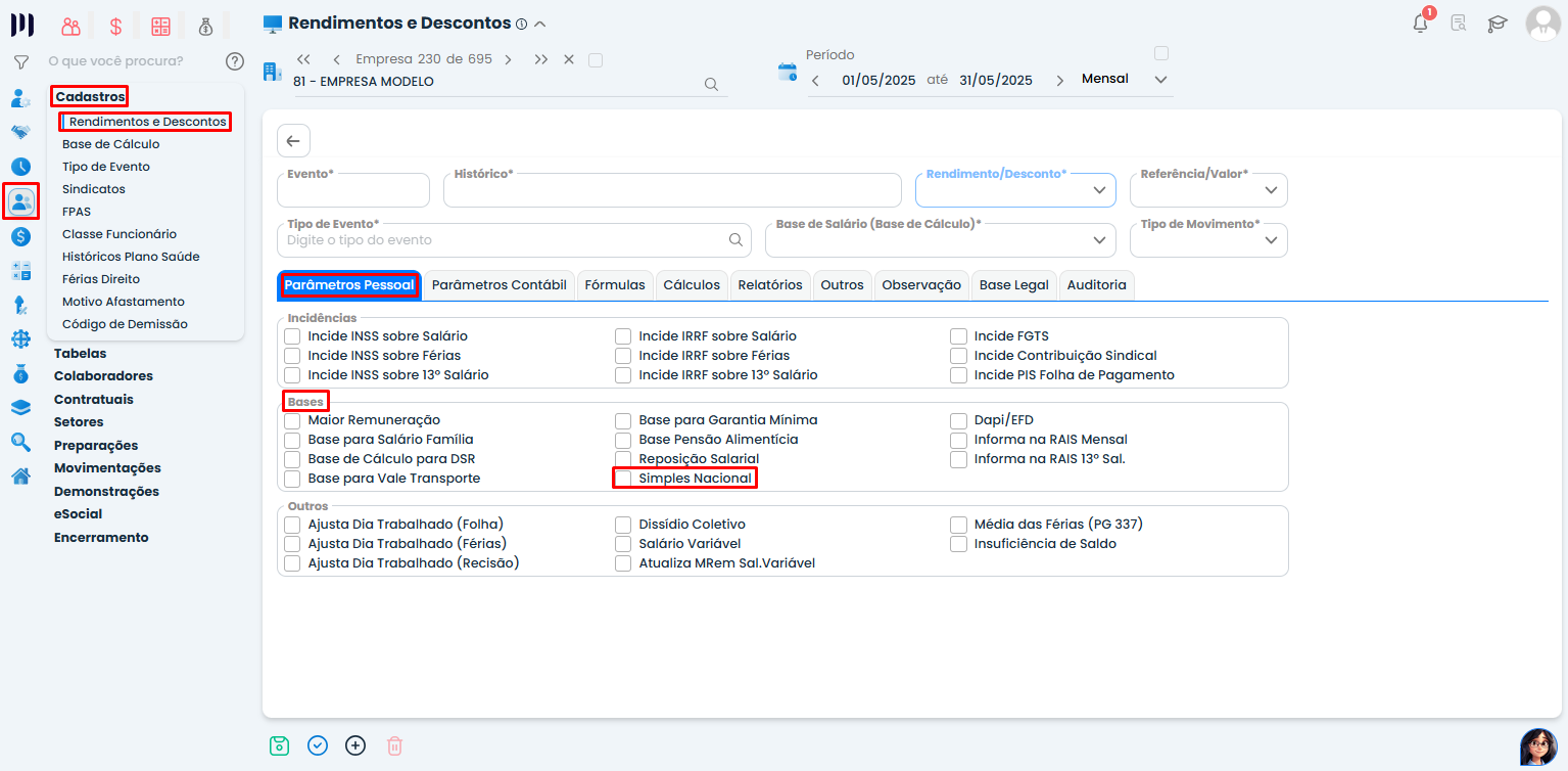 Passo 5: Marque a opção Simples Nacional para que essa rúbrica seja considerada no cálculo e envio fiscal.