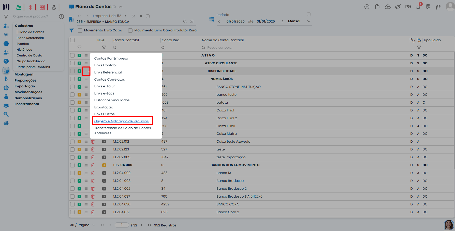 Passo 3: No submenu da conta (representado por três linhas horizontais), clique na opção Origem e Aplicação de Recursos.