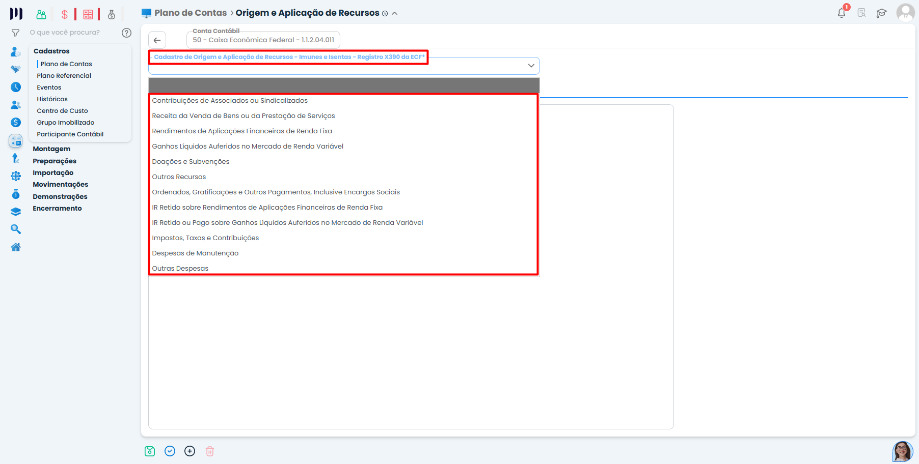 Passo 6: Configure os campos de acordo com a origem ou aplicação de recursos da conta selecionada. Essa configuração será usada para compor o Registro X390 automaticamente no momento da geração da ECF.