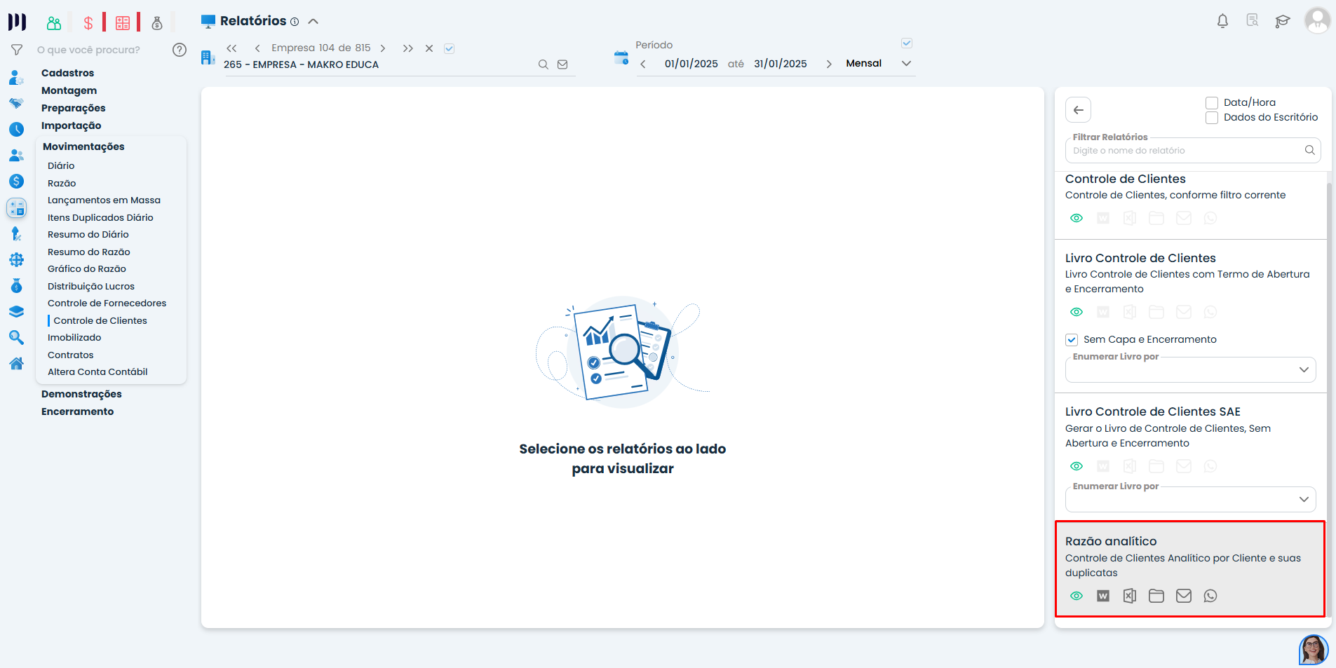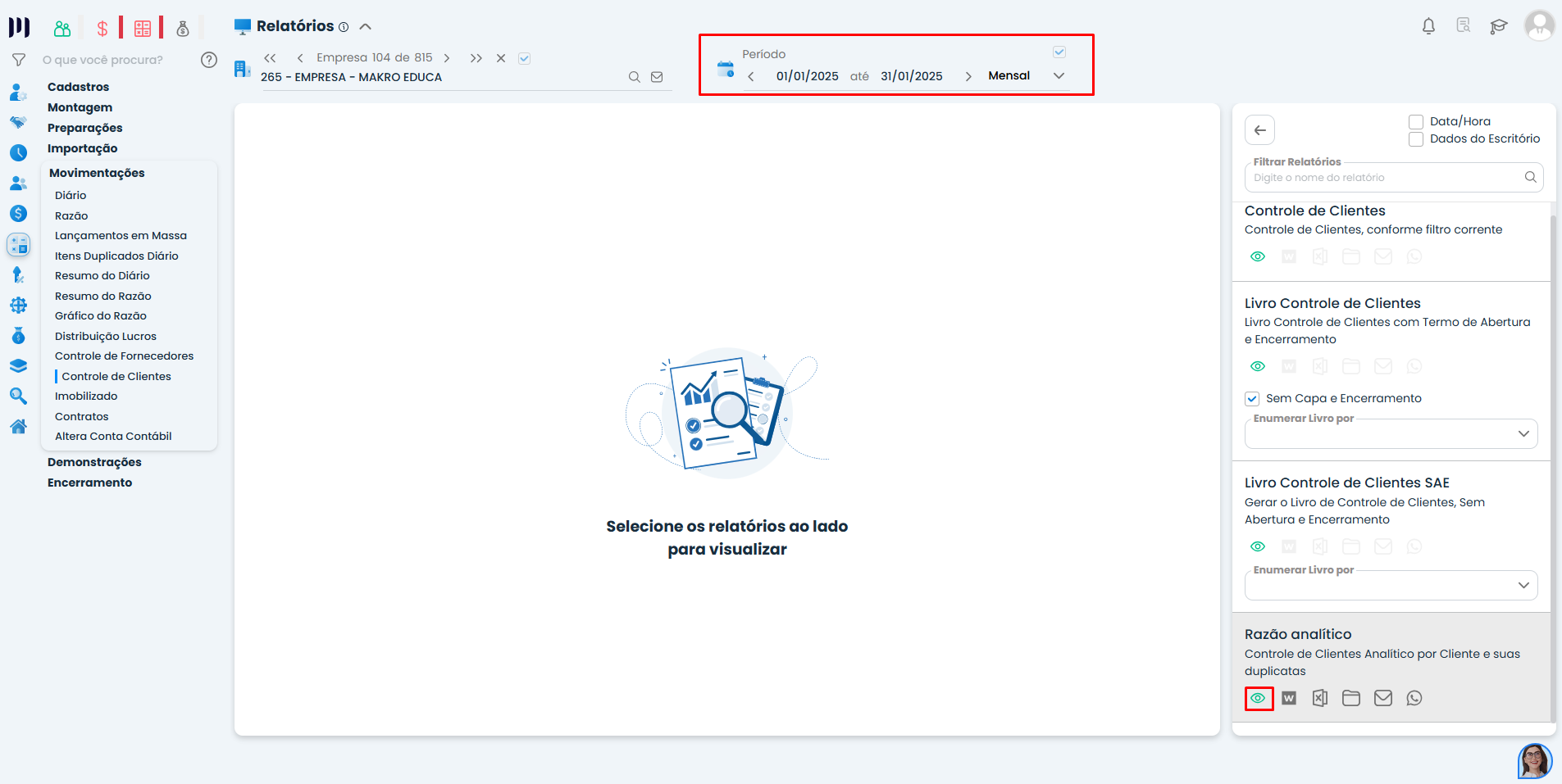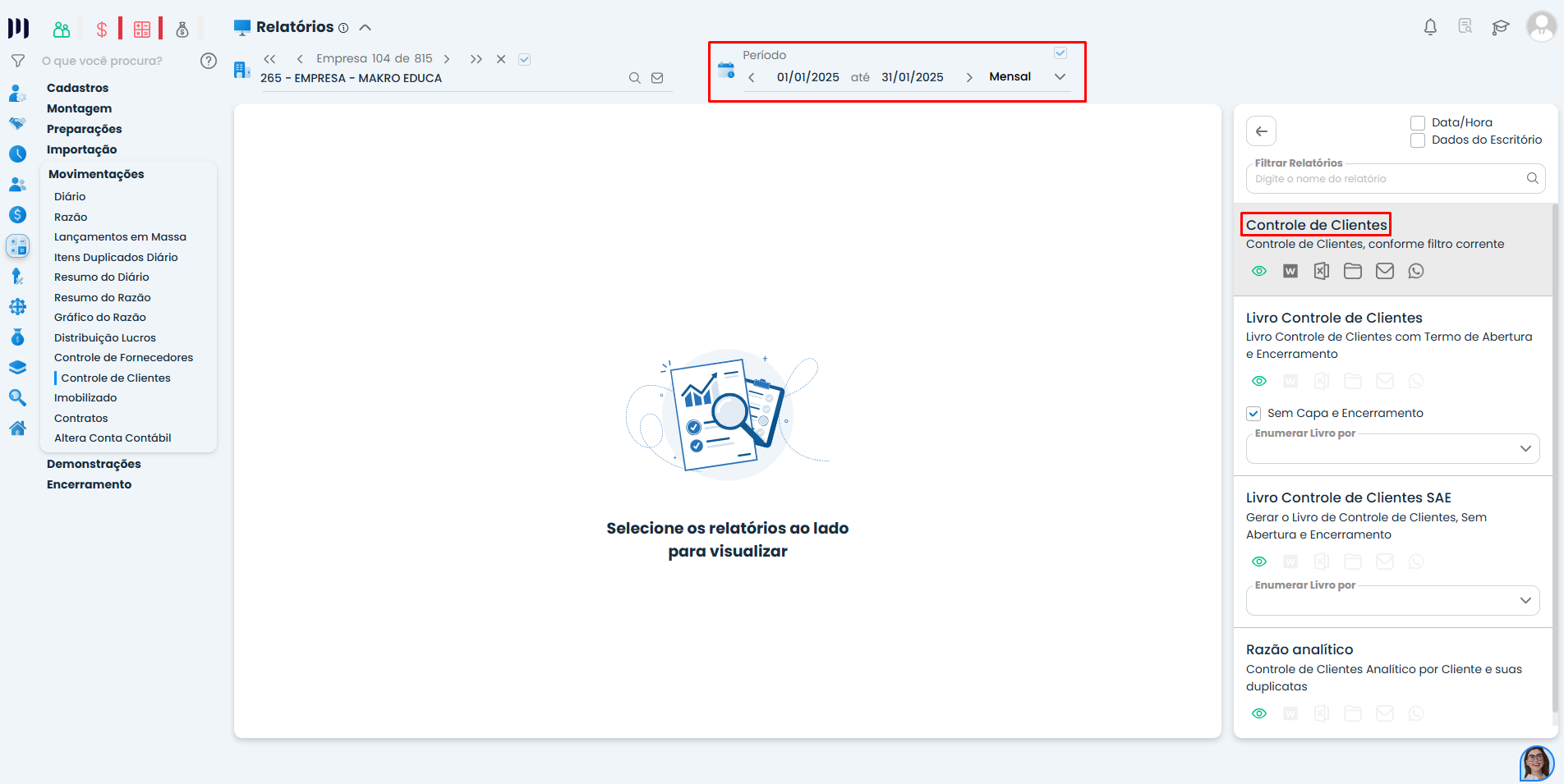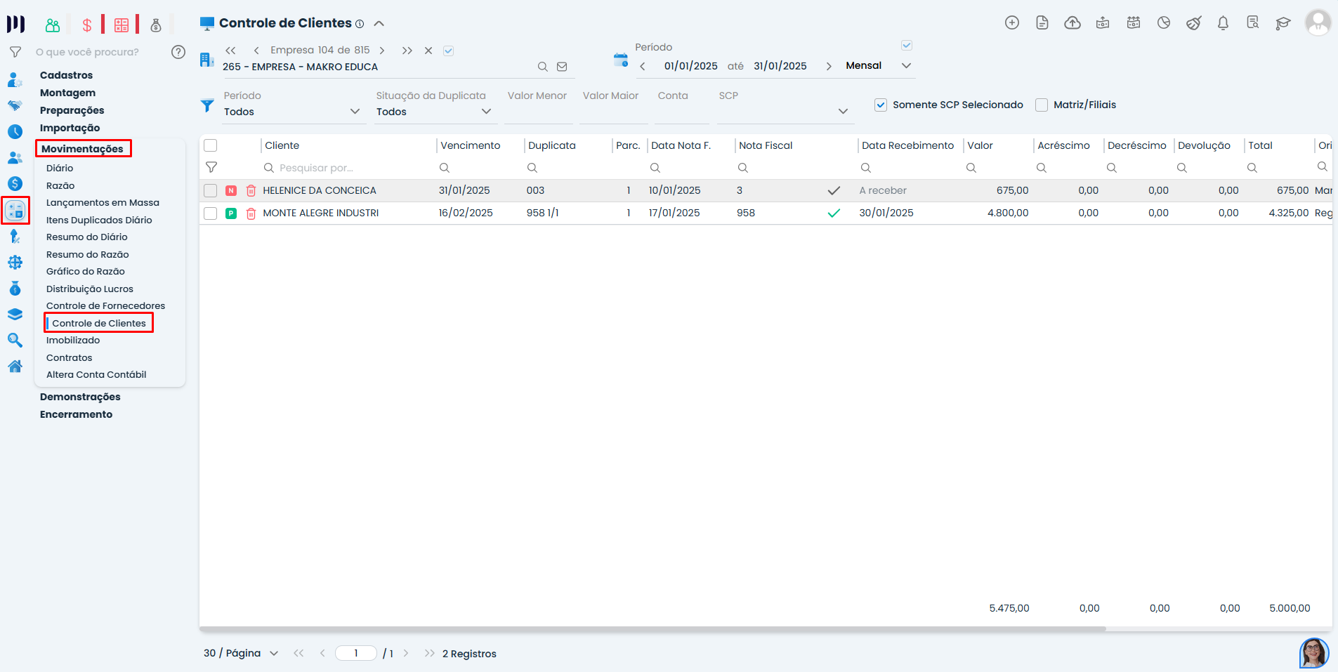 Navegue até Contábil > Movimentações > Controle de Clientes