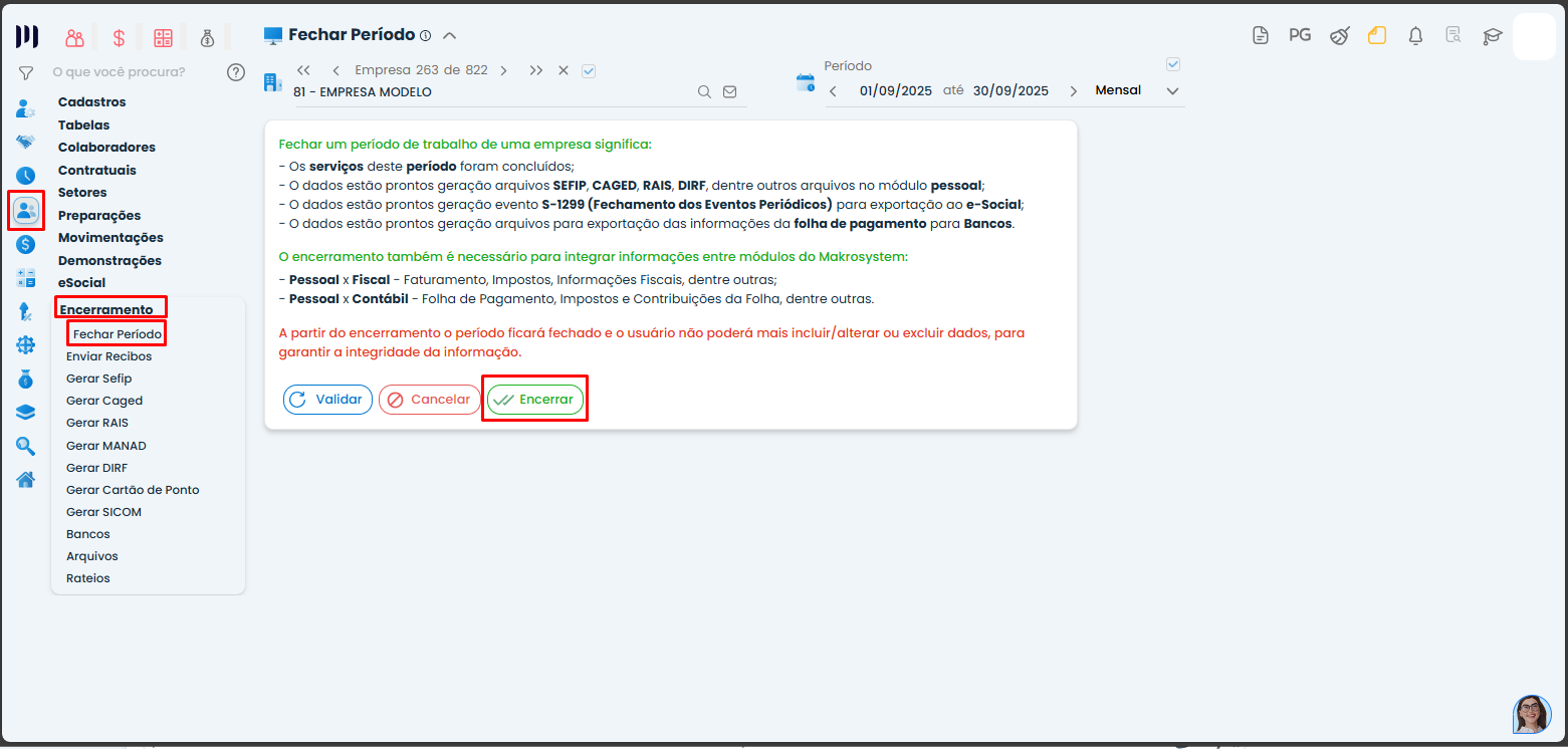 Passo 12: Acesse o menu Pessoal>Encerramentos>Fechar período, e faça o encerramento do período;