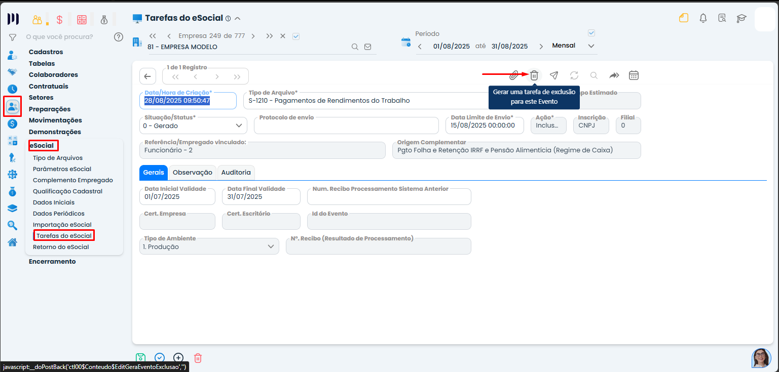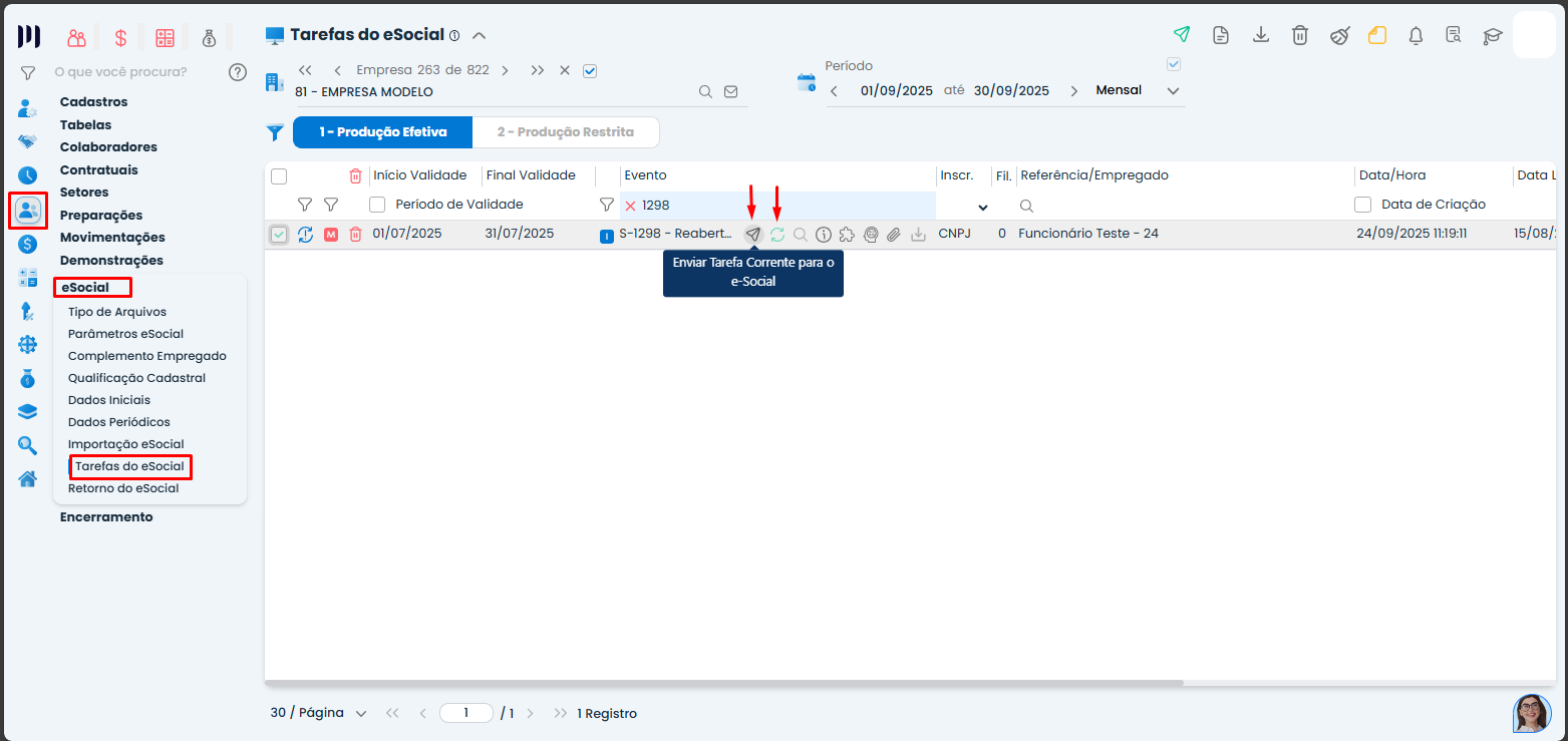 Passo 4: Envie apenas o evento S-1298 do mês que será alterado. Exclua os demais.