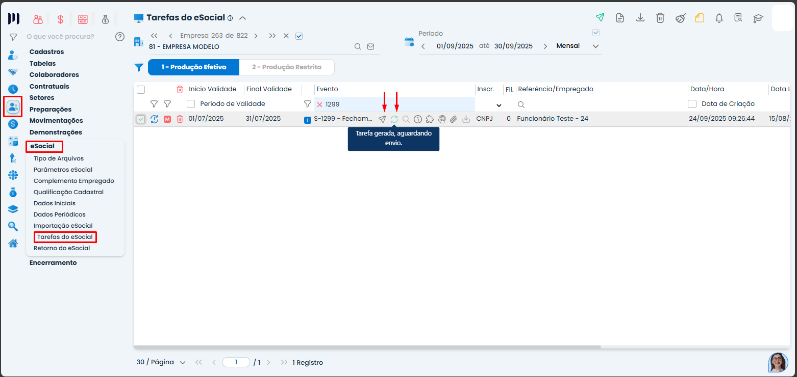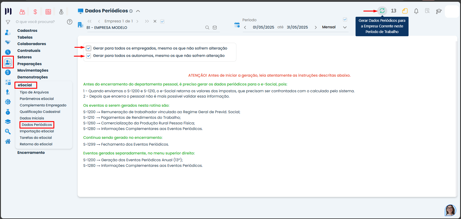 Passo 8: Gere os eventos periódicos no ícone ‘Gerar dados periódicos para a empresa corrente neste período de trabalho’;