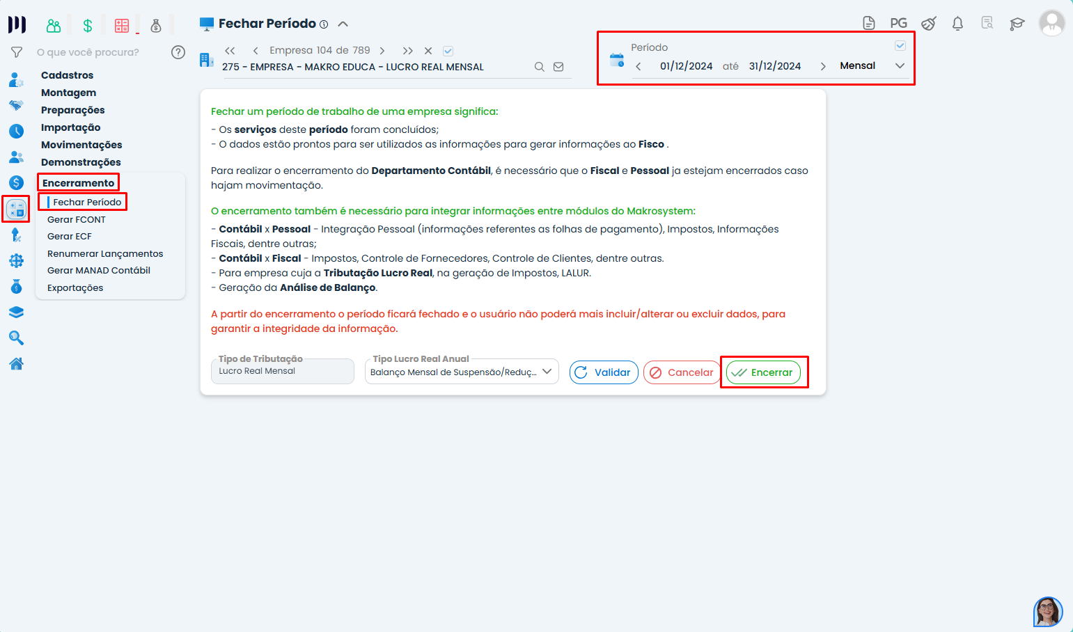 Passo 1: Acesse Contábil > Encerramento > Fechar Período – Encerrar.