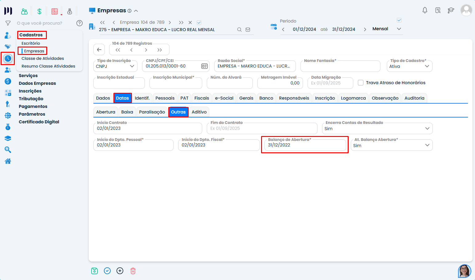 Passo 1: Acesse Preparar > Cadastros > Empresa > Empresa Corrente > Datas > Outras > Data Balanço Abertura.