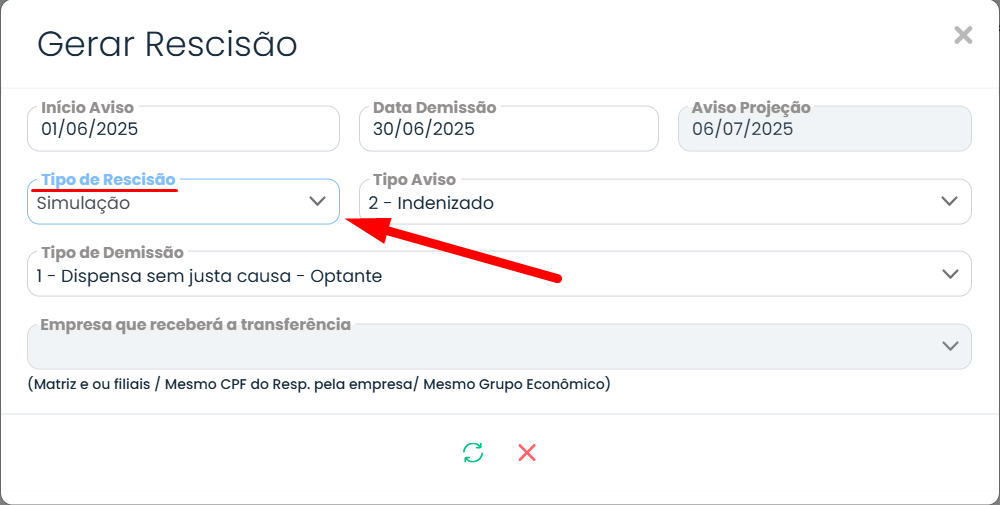 No campo Tipo de demissão, selecione a opção “Simulação”
