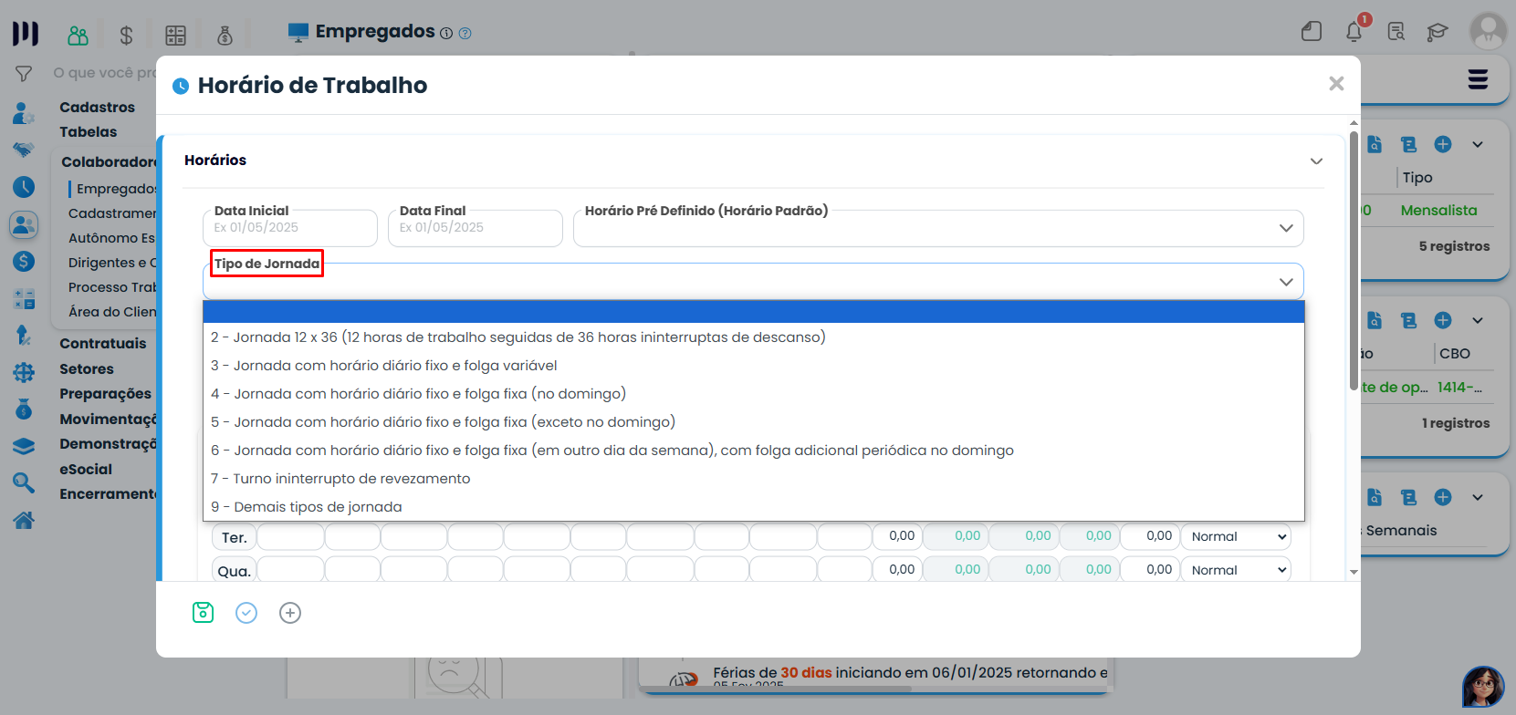 Passo 3: No campo “Tipo de jornada”, selecione a opção que corresponde à jornada praticada pela empresa (exemplo: jornada parcial, turno fixo, intermitente, etc.).