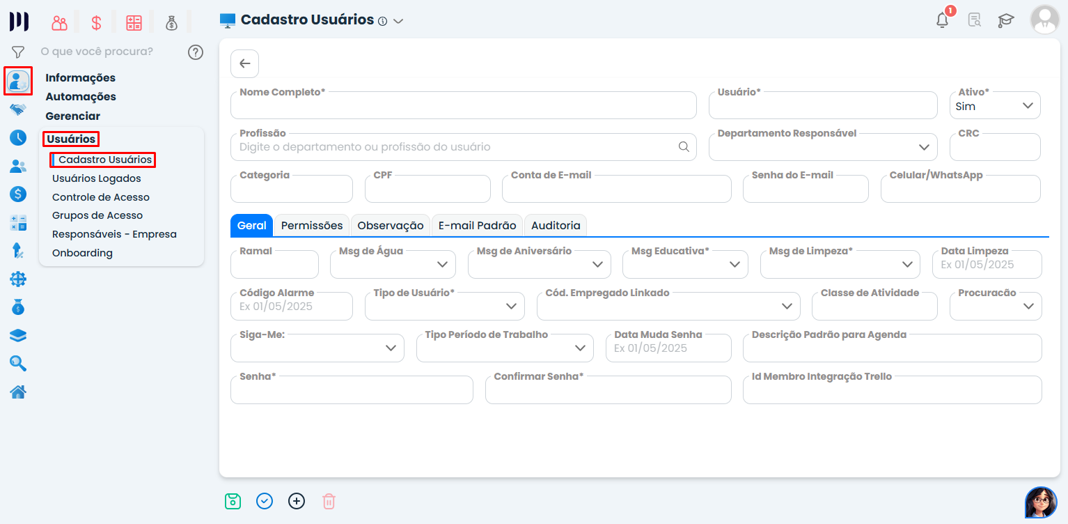 Passo 2: Na tela de usuários, selecione Cadastro usuário para verificar as informações do usuário responsável.
